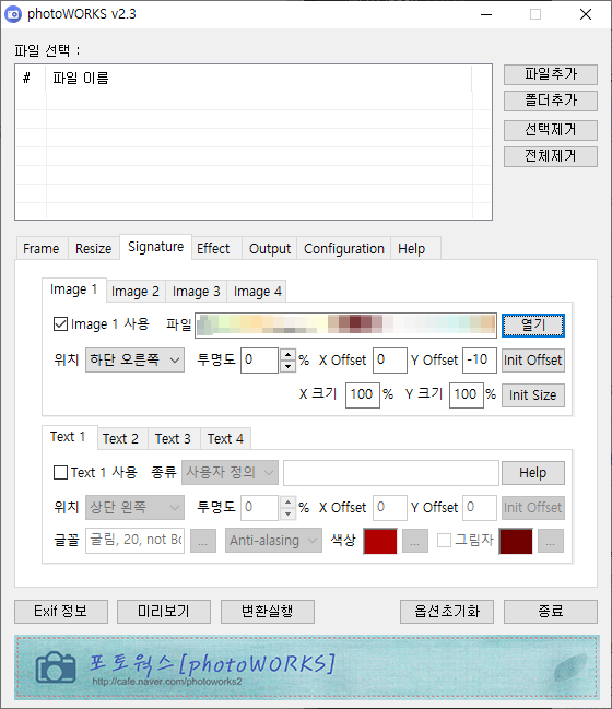 마지막으로 설명해 드릴 세 번째 탭인 [Signature]가 바로 워터마크를 삽입하는 옵션인데요. 간편하게 아래에 [Text 1] 탭을 이용해서 직접 글자를 삽입할 수도 있고 저 같은 경우는 이렇게 만들어둔 이미지를 사용하기 위해 상단에 [Image 1] 탭의 Image 1 사용을 체크하고 파일 열기 버튼을 클릭해서 제 워터마크 이미지 파일을 선택해서 사용 중이랍니다. 이렇게 한 번 설정을 적용해 놓으면 블로그용 사진 보정을 다 끝낸 후 포토웍스[photoWORKS]에서 첨부할 사진을 다 불러오고 변환실행 버튼 클릭으로 스킨과 리사이즈 워터마크 삽입까지 한 번에 끝나게 된답니다.