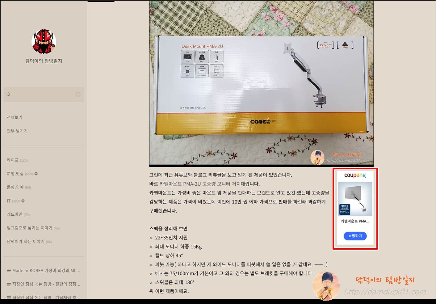 지난 23일, 모니터 팔 달아주느라 제 팔은 고장 날 지경이네요. 카멜마운트 PMA-2U 고중량 모니터 거치대 / 개봉기 / 장착기 포스트에 댓글로 문의가 하나 있었어요. "쿠팡 파트너스 링크는 어떻게 글 옆에 표기되게 하나요?"라는 문의였는데요.