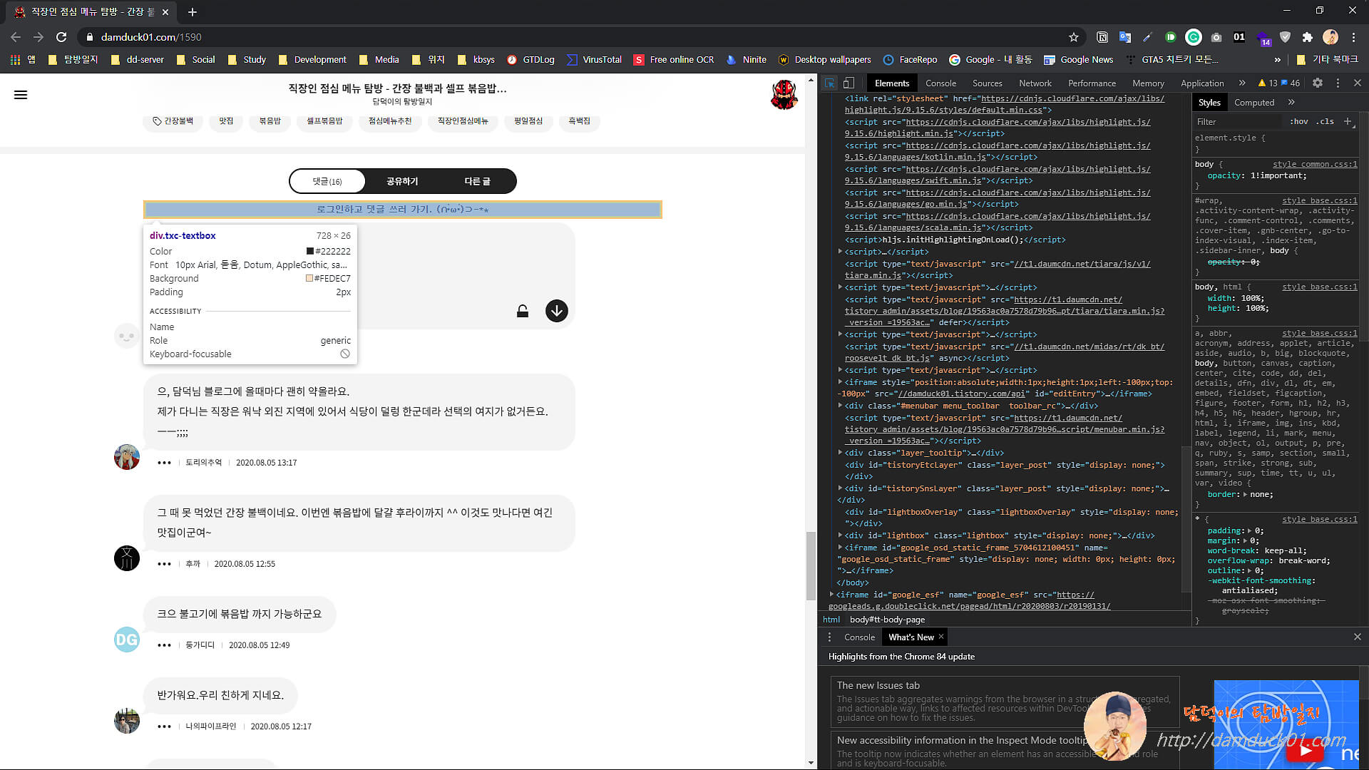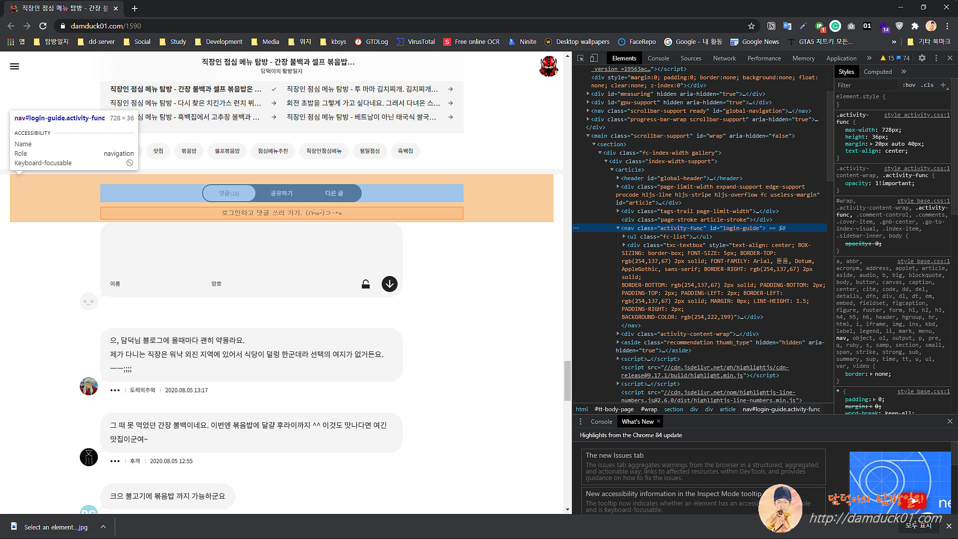 그럼 이렇게 우측의 소스 부분이 해당 위치의 소스가 있는 곳을 보여줍니다. 저는 처음에 [로그인하고 댓글 쓰러 가기. (∩•̀ω•́)⊃-*⋆] 영역에 id="login-guide"를 작성했는데 댓글 입력란이 미세하게 가려지더라고요. 그래서 위에 보이는 댓글 영역 <nav class="activity-func">에 id="login-guide"를 작성해서 테스트를 해 보니 제대로 위치가 잡히더라고요.