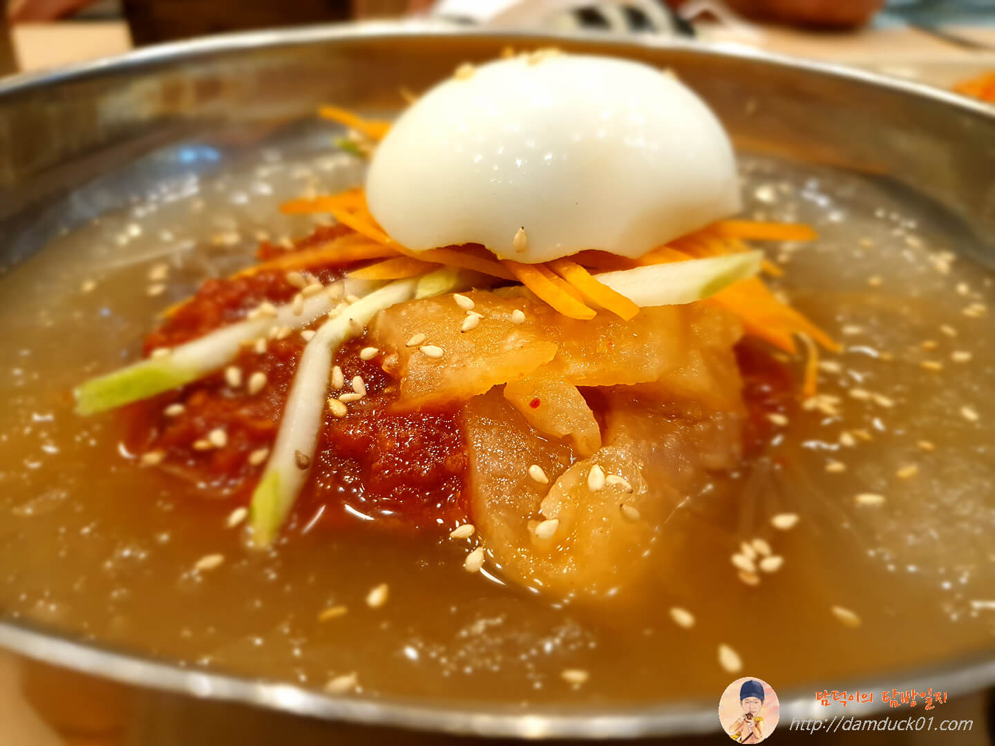 냉면을 비비기 전에 먼저 국물을 마셔봤는데 와우~ 일단 시원하고 새콤한 국물이 들어가니까 정신이 좀 깨긴 하더라고요.