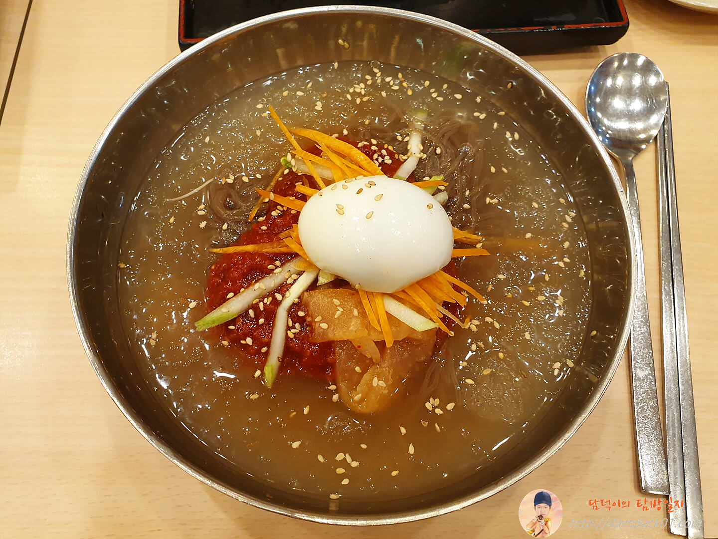 냉면을 비비기 전에 먼저 국물을 마셔봤는데 와우~ 일단 시원하고 새콤한 국물이 들어가니까 정신이 좀 깨긴 하더라고요.