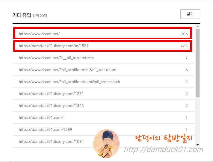 해당 글의 기타 유입 순위를 확인해 보면 https://www.daum.net 경로가 다음 PC의 메인을 통한 유입으로 706이고 https://damduck01.tistory.com/m/1589 경로가 다음 모바일의 여행맛집 채널을 통한 유입으로 663을 기록해서 등록 당일 다음 메인으로 인한 유입 수는 1,369로 소박을 기록했어요.