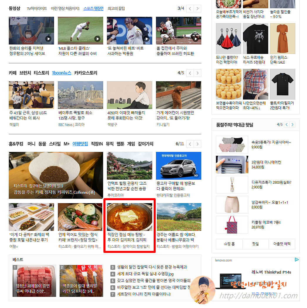 2020년 08월 06일 다음 PC 사이트의 메인 화면입니다. 여행맛집 채널에 제 포스트가 딱!