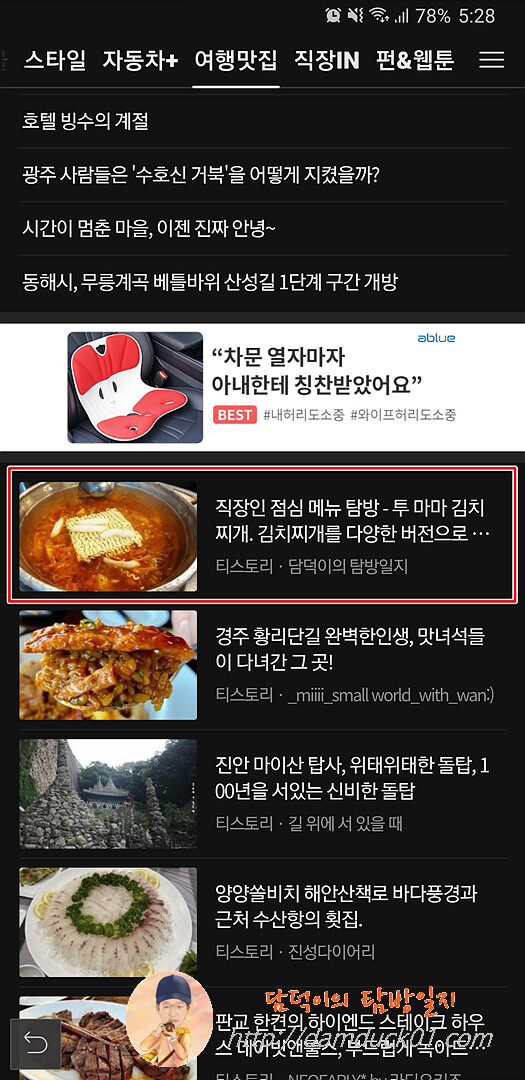 다음 PC 사이트의 여행맛집 채널에 등록이 되면 다음 모바일 사이트에도 등록이 된 경우가 대부분이죠. 역시나 어제도 다음 모바일 사이트의 여행맛집 채널에서도 제 글을 확인할 수 있었습니다.