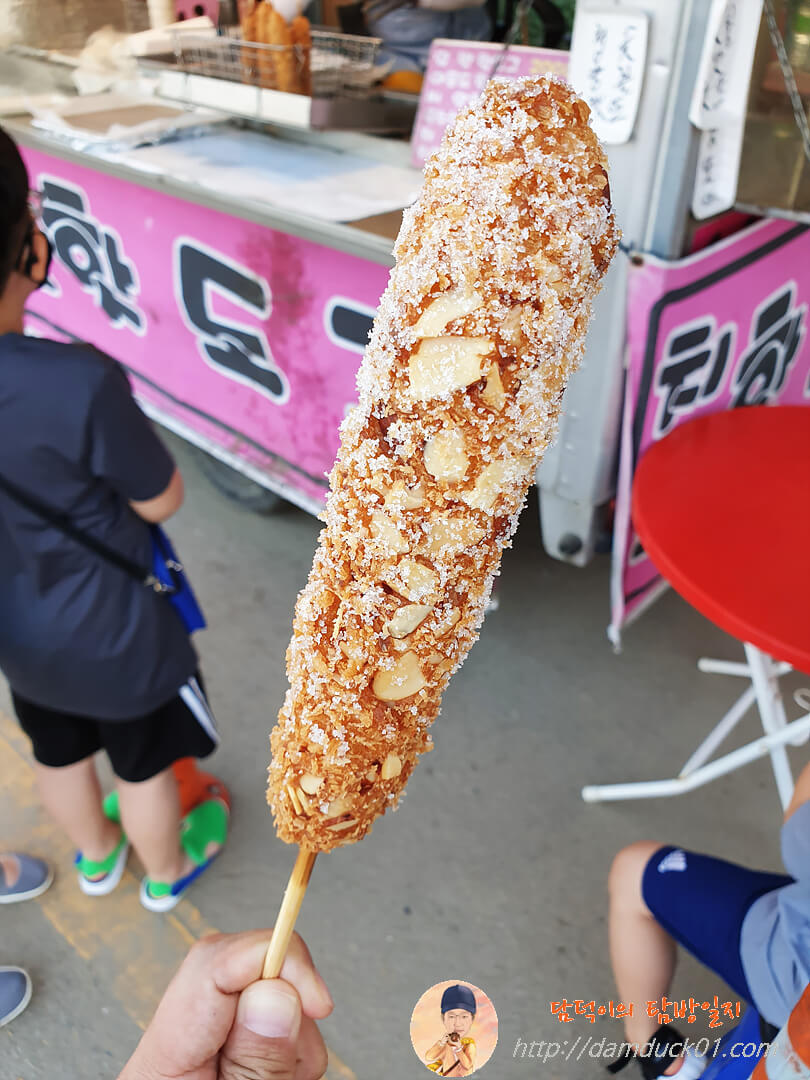 이건 가람이가 주문한 아몬드 핫도그인데 설탕 가득 묻혀 주고