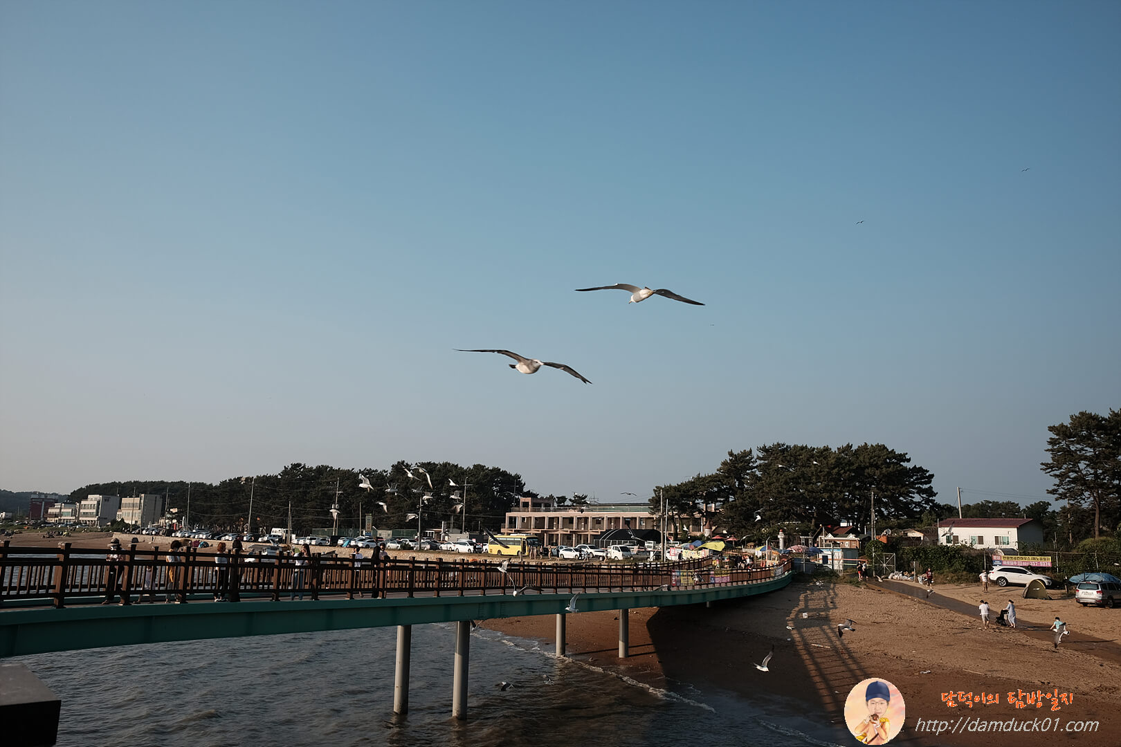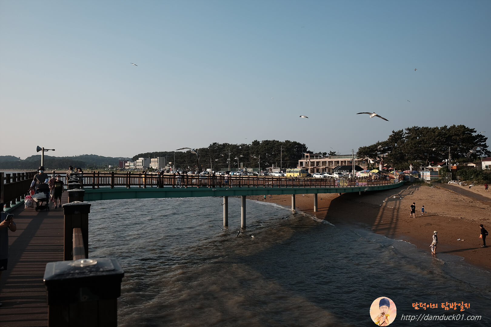 보행교를 다 지나기 전 벌써 썰물이 시작되었습니다. 차가 다니는 도로가 벌써 모습을 보이기 시작했네요.