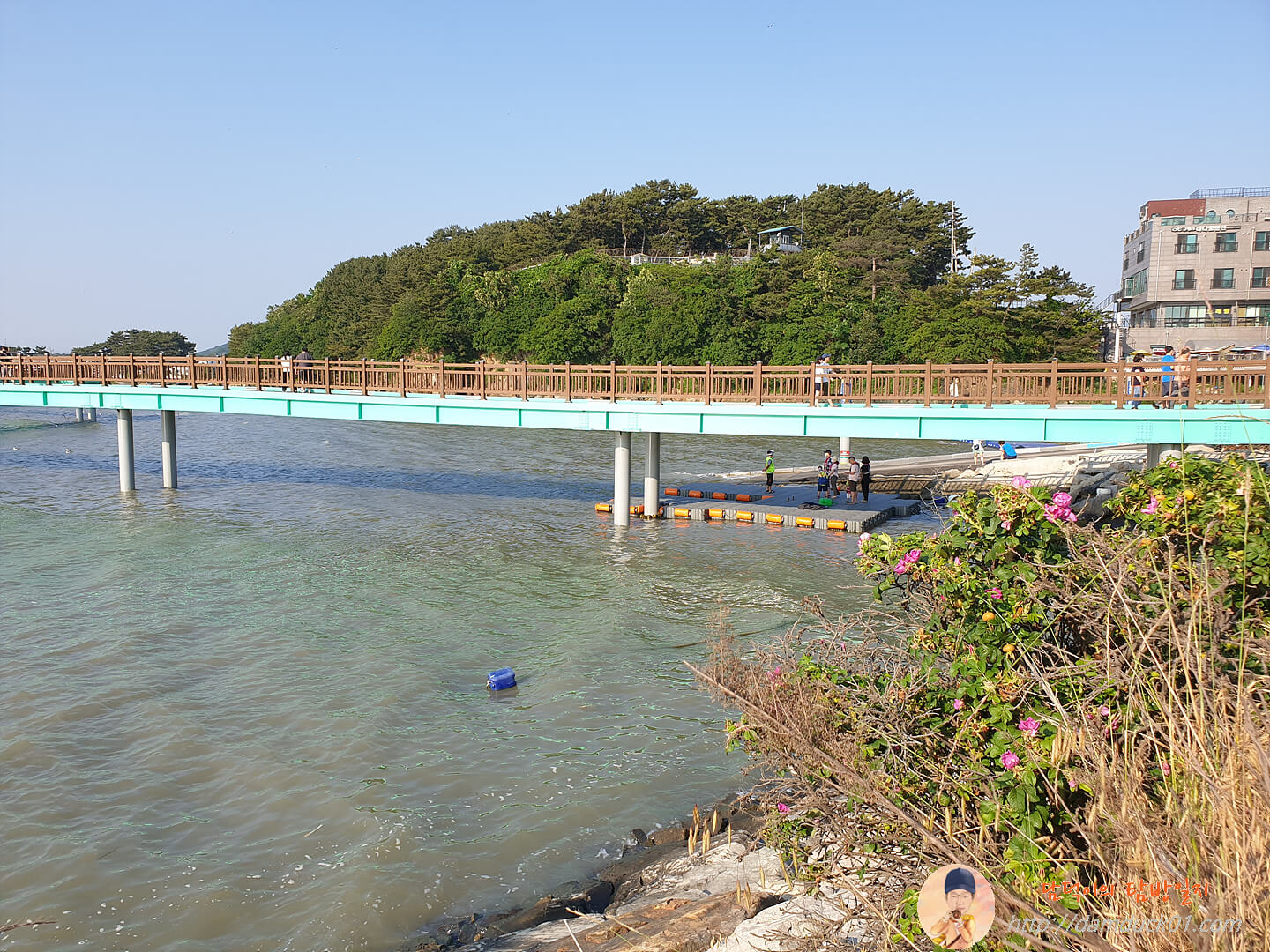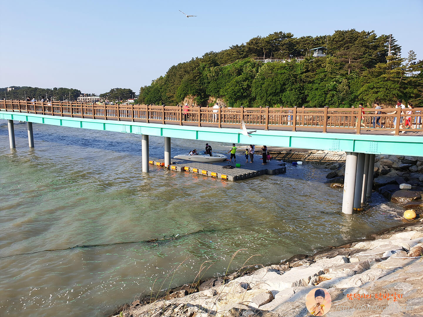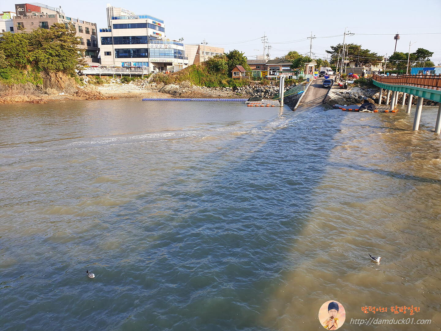 지난번 방문 때와는 다르게 밀물로 일해서 아래쪽 차량이 다닐 수 있는 도로는 물에 잠겼네요. 그래서 이때는 위 보행교로만 들어갈 수 있었어요. 이렇게 밀물 때는 모터보트도 탈 수 있더라고요.