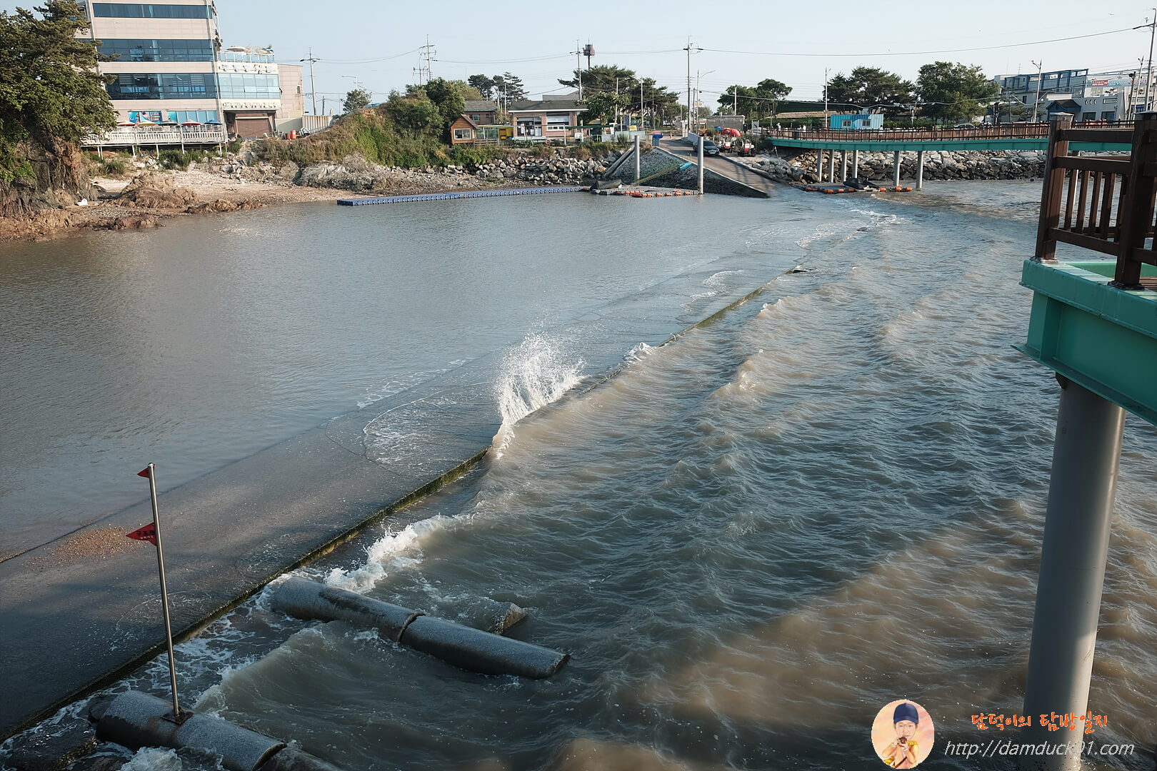 지난번 방문 때와는 다르게 밀물로 일해서 아래쪽 차량이 다닐 수 있는 도로는 물에 잠겼네요. 그래서 이때는 위 보행교로만 들어갈 수 있었어요. 이렇게 밀물 때는 모터보트도 탈 수 있더라고요.