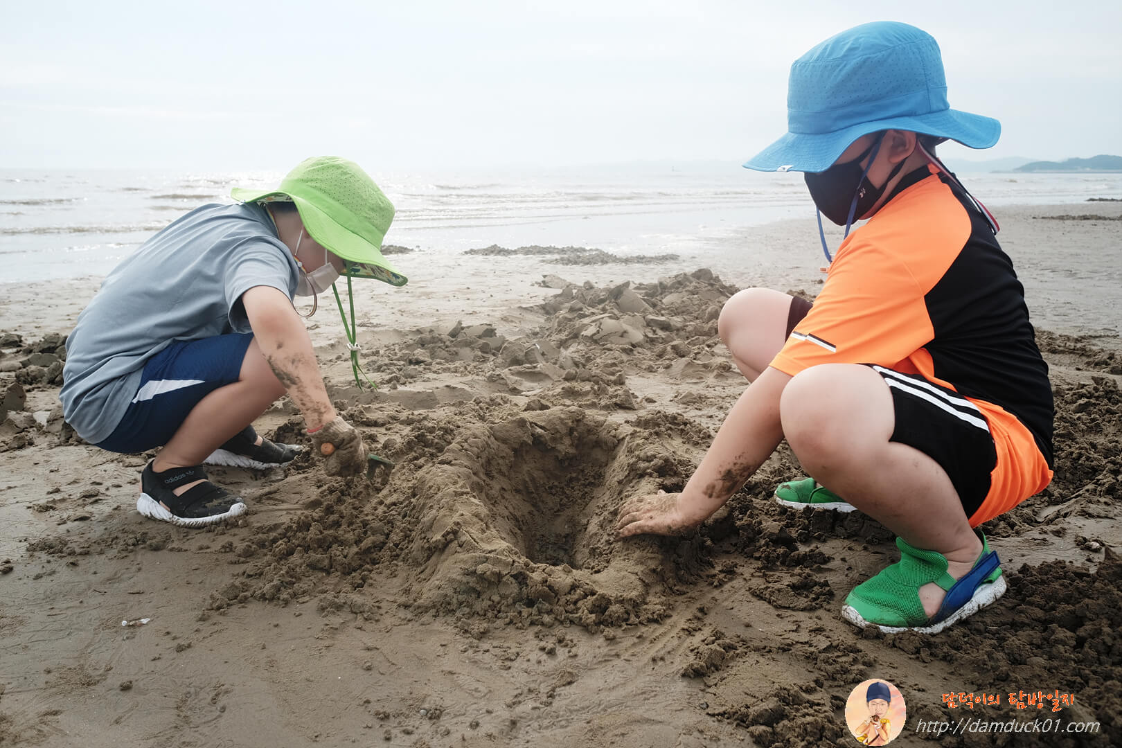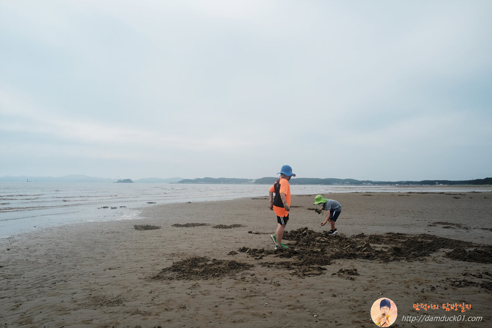 이러는 사이 사진 공개 허락이 없어서 보여드리지는 못하지만 아내는 정말 집요하게 맛조개를 찾아다니고 있었답니다. 그러다 주변에 엄청나게 많이 잡은 가족의 도움을 받아서 몇 마리 잡기도 했어요. 그 가족이 땅을 파다가 맛조개 구멍이 보이면 우리 가족을 불러 주셔서 잡을 수 있게 기회를 주셨거든요. 그래서 아이들이 방벽 만들기를 하다가 뛰어와서 다행히 맛조개 잡기 체험을 할 수는 있었어요.