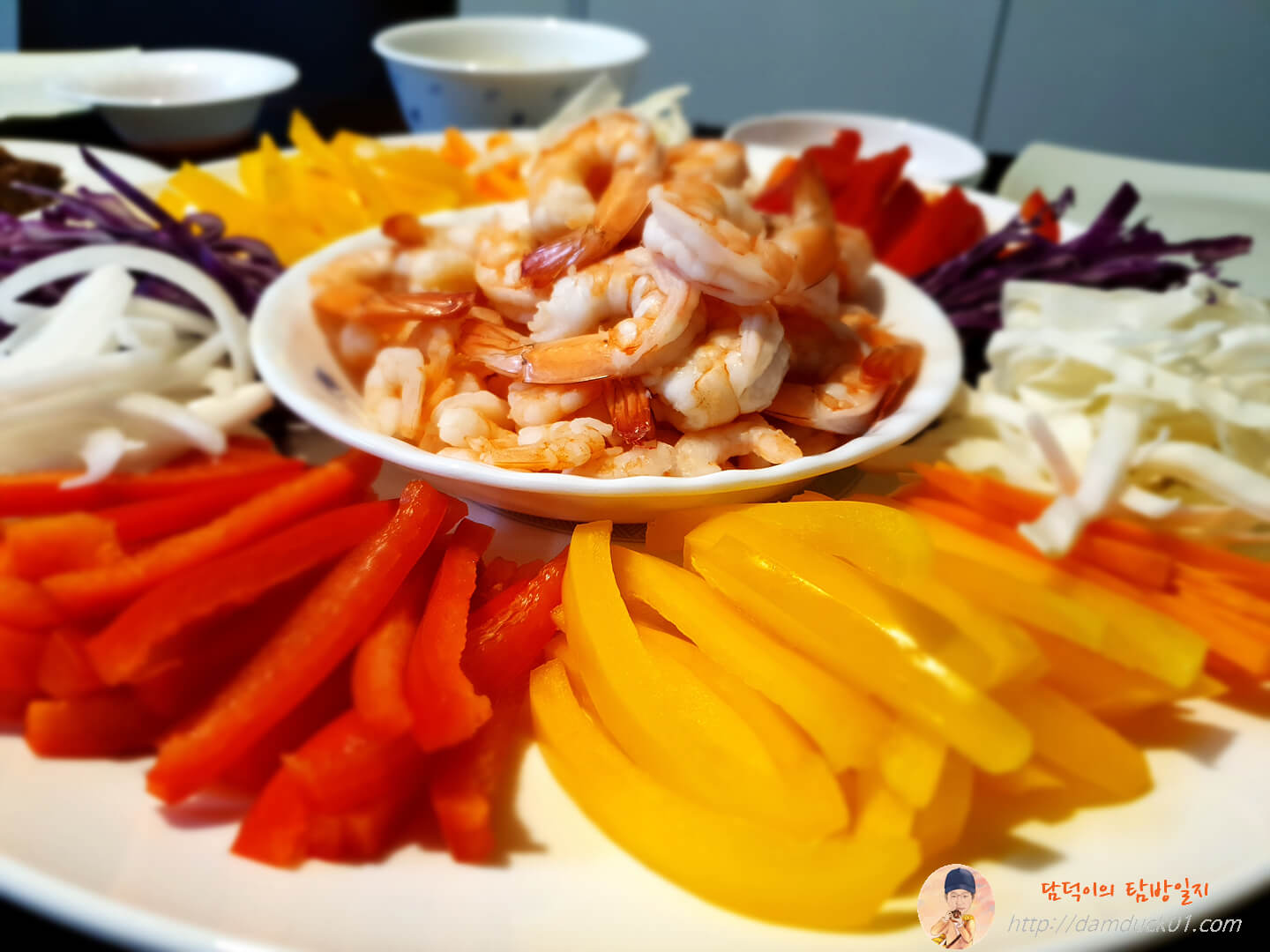 새우도 있고 파프리카랑 양배추, 적양배추랑 양파까지 썰어서 준비 완료.