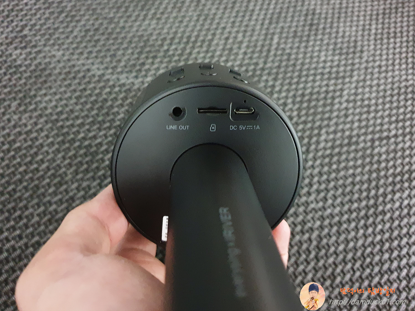 한 번 자세히 살펴볼게요. 외부 오디오를 연결할 수 있는 Line Out 단자가 있고 마이크로 SD 슬롯, 충전용 마이크로 5핀 단자가 보입니다. 블루투스 연결 없이 마이크로 SD 카드에 음악을 넣어서 듣거나 따라 부를 수도 있고 미디 파일을 담아서 노래를 불러 볼 수도 있겠죠. 내장된 배터리는 2,200mAh로 스펙상 최대 4시간 사용이 가능하고 충전 시간은 약 3.5시간입니다. 우리 가족은 배터리가 떨어질 때까지 한 번에 다 불러 본 적은 없어서 배터리가 부족한 걸 딱히 느껴보지는 못했어요.