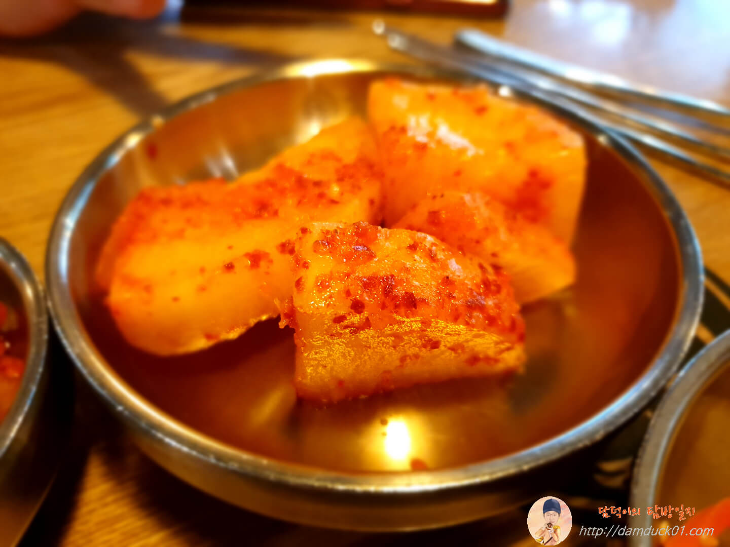 이 빈 접시에는 테이블 작은 항아리에 준비되어 있는 깍두기를 덜어줍니다.