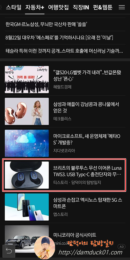 그래도 다음 모바일 사이트는 캡처 성공했어요. 자동차+ 채널에도 등록이 된 걸로 봐서 PC 사이트의 티스토리 채널뿐 아니라 M+ 채널에도 등록된 걸로 추정됩니다.