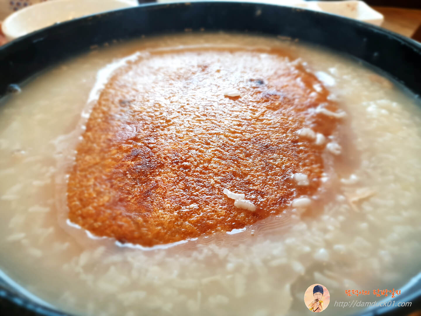 누룽지는 거대한 뚝배기에 닭죽처럼 밥알 넣고 끓인 것 위에 커다란 누룽지를 띄워서 나와요.