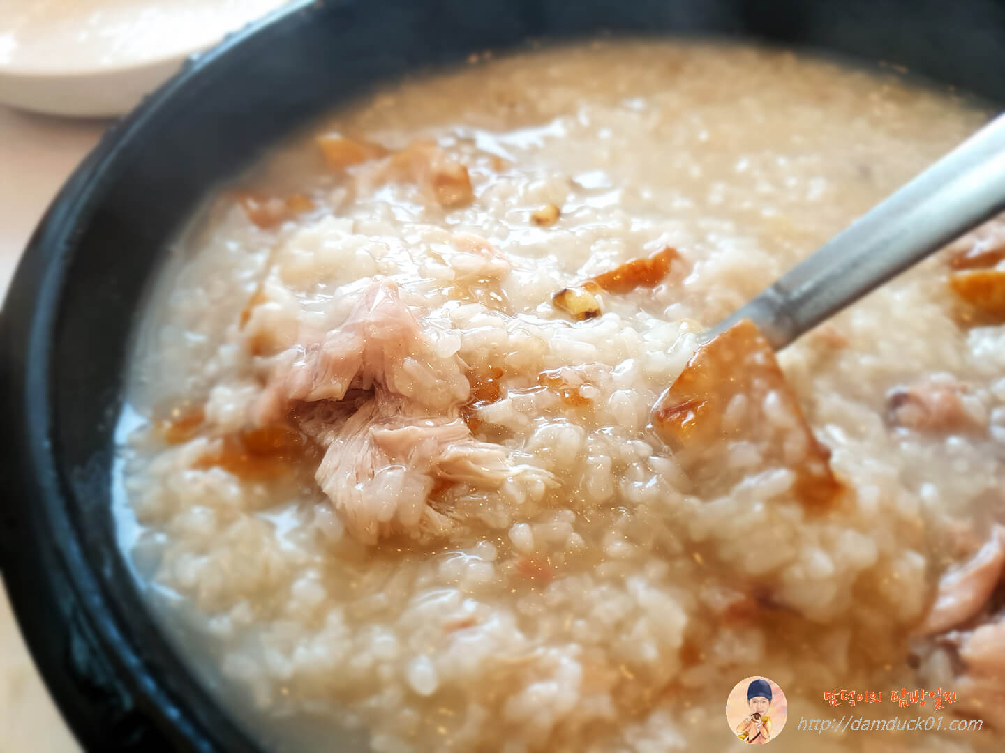국자를 이용해서 누룽지를 찍어서 죽과 함께 섞어서 먹으면 이게 진짜 별미죠. 안에는 닭고기도 조금 들어 있고요.