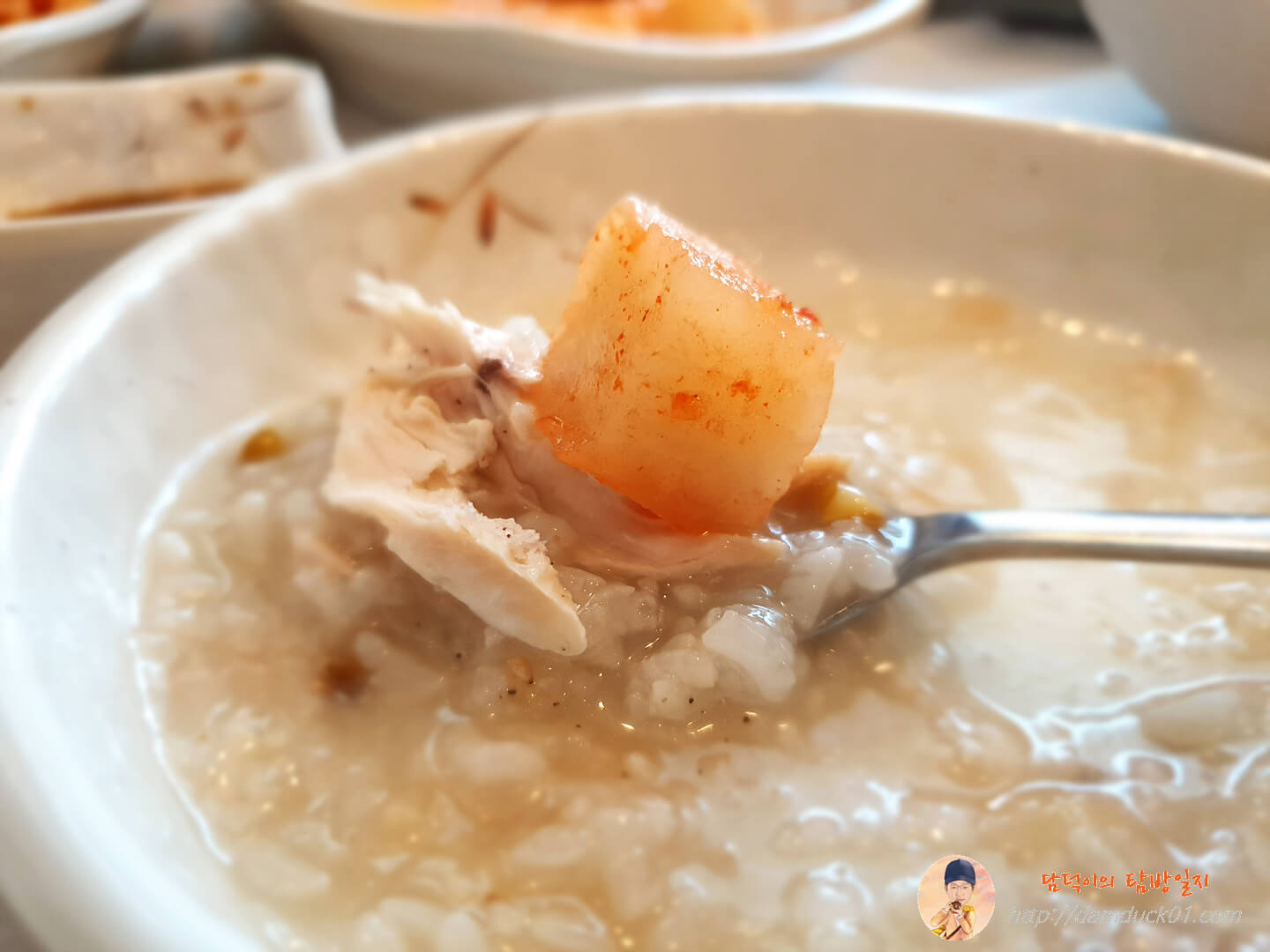 국자를 이용해서 누룽지를 찍어서 죽과 함께 섞어서 먹으면 이게 진짜 별미죠. 안에는 닭고기도 조금 들어 있고요.