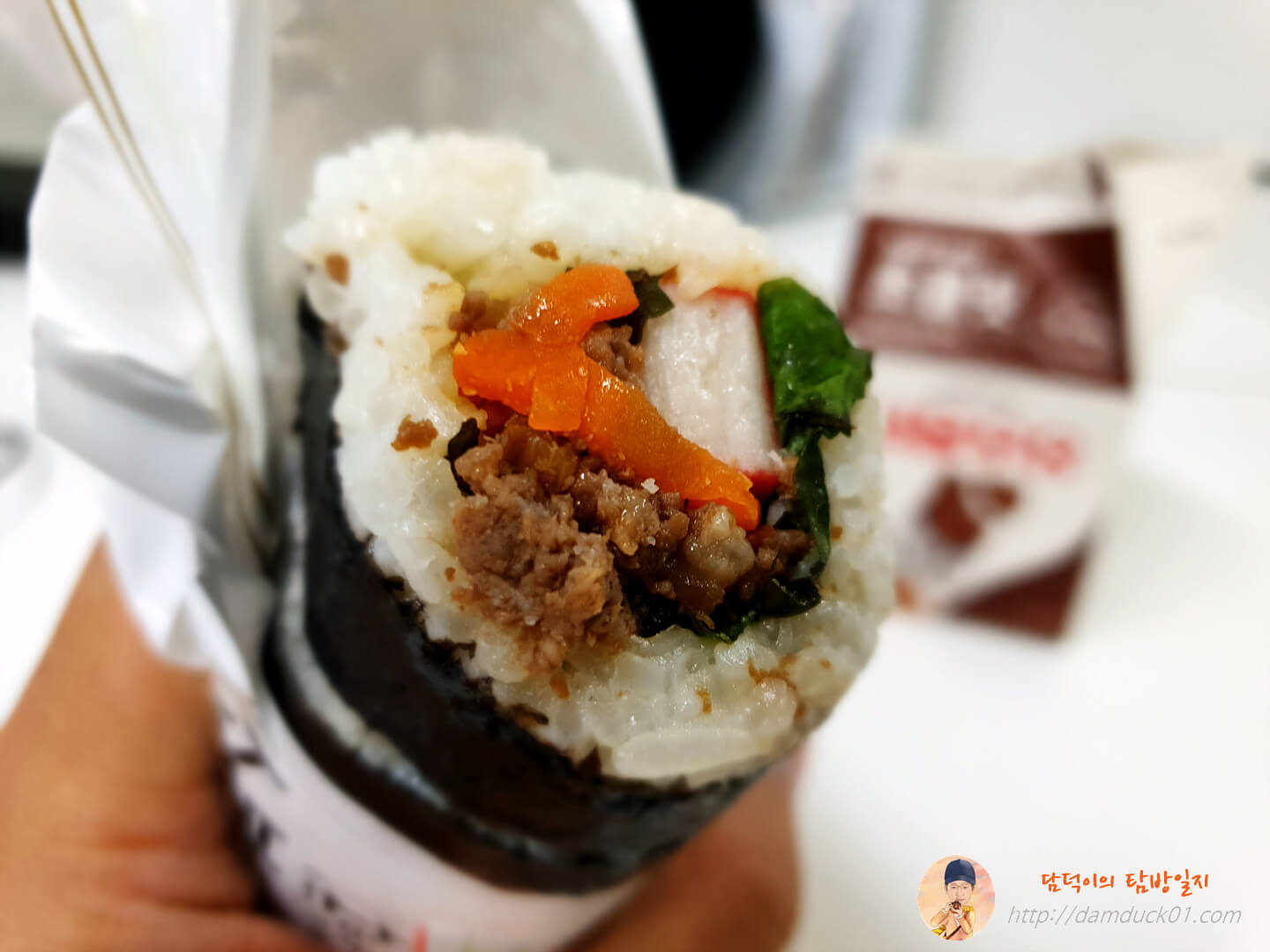김밥 포장지에 있는 김밥 사진은 정말 광고 문구처럼 양념 소 불고기의 풍미가 느껴질 거 같네요.
