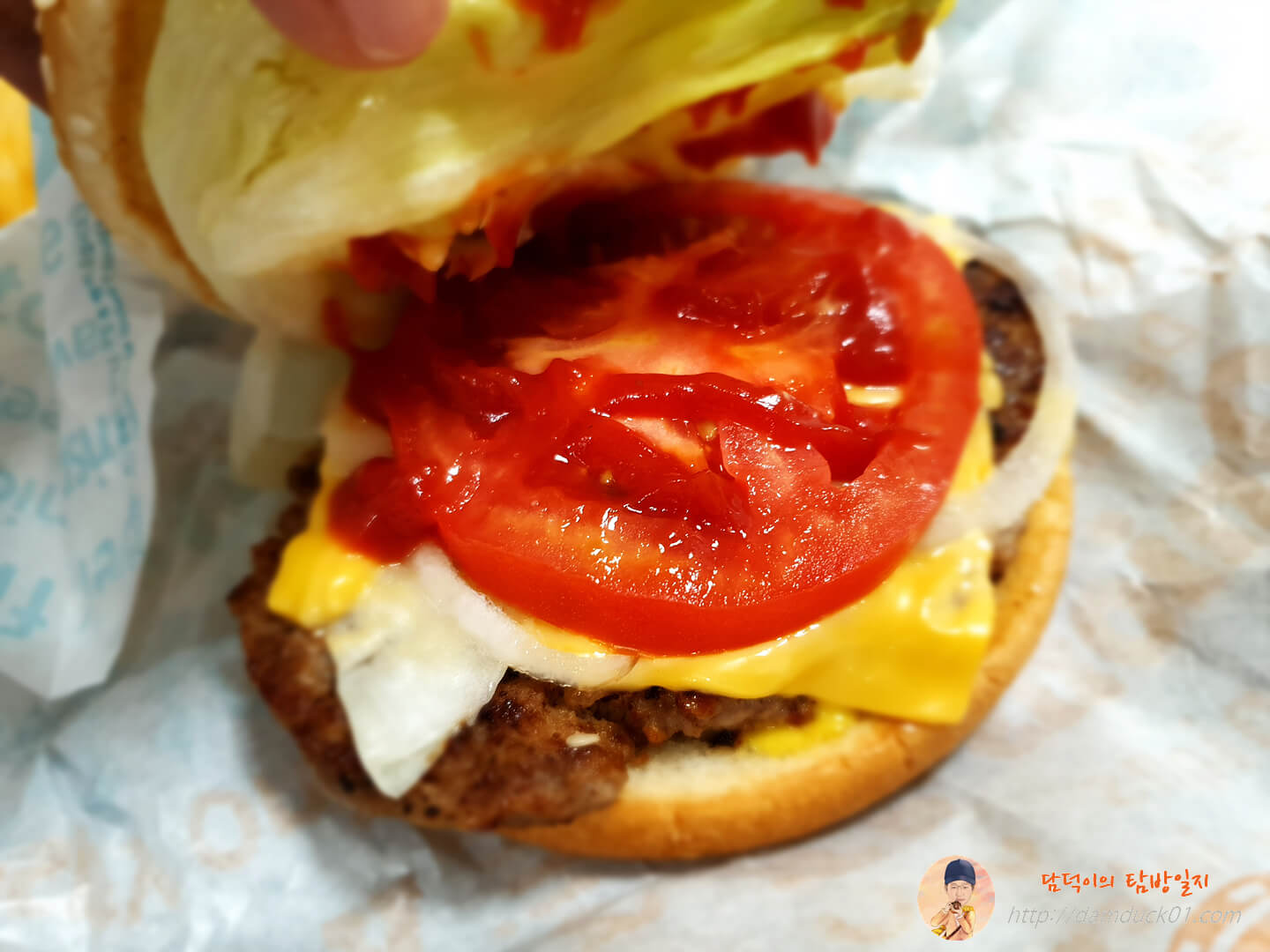 패티가 보이고 치즈랑 양상추가 보이네요.