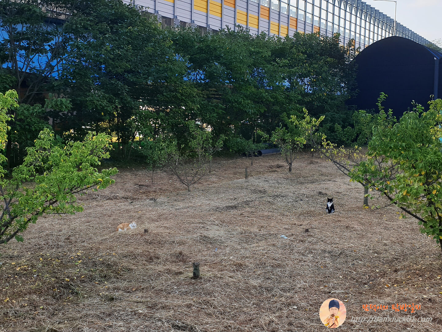 작은 과수원 한가운데에서 여유 있는 시간을 보내는 고양이 두 마리.