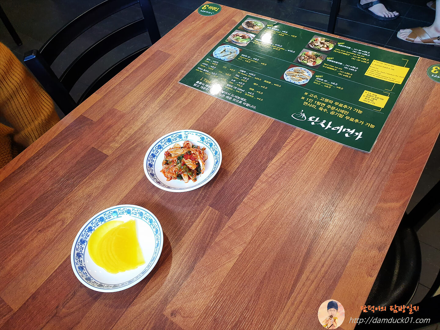 아직 완차이면가로 되어 있는 메뉴판과 기본 반찬인 단무지, 배추김치 그리고 사진에는 보이지 않지만 시원한 얼음물까지 준비가 되어 있었습니다.