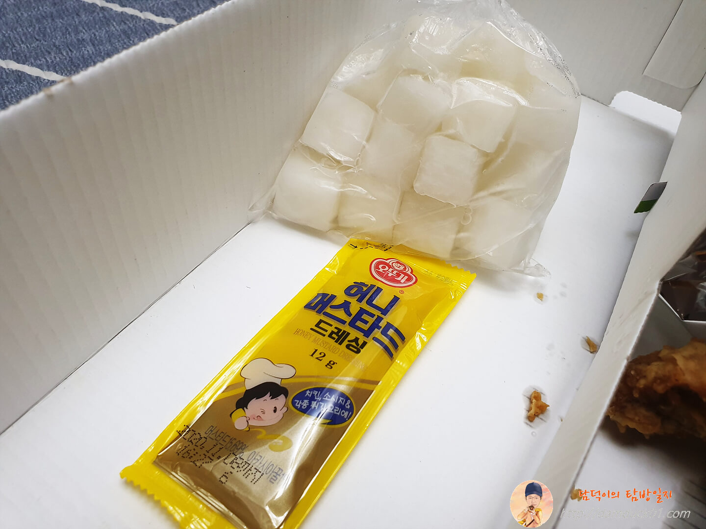 콜라 작은 거 하나랑 오뚜기 허니 머스타드 드레싱 그리고 치킨 무가 들어 있는데요.