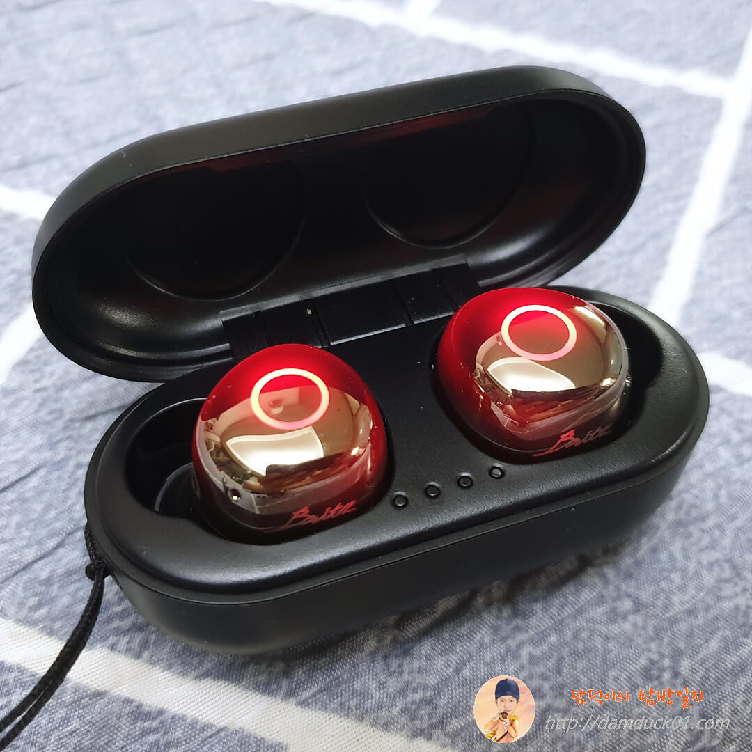 충전 케이스를 열면 반짝반짝하는 하이그로시 재질의 이어 버드가 모습을 드러냅니다. 케이스 가운데에는 충전 케이스의 배터리 상태를 확인할 수 있는 4개의 LED가 보이는데 개인적으로는 이 배터리 잔량 표시는 뚜껑을 열지 않아도 확인할 수 있는 외부에 위치하는 게 좋다는 생각을 가지고 있는데 브리츠의 경우는 아직 많은 모델들이 전부 뚜껑 안쪽에 위치하고 있어요.