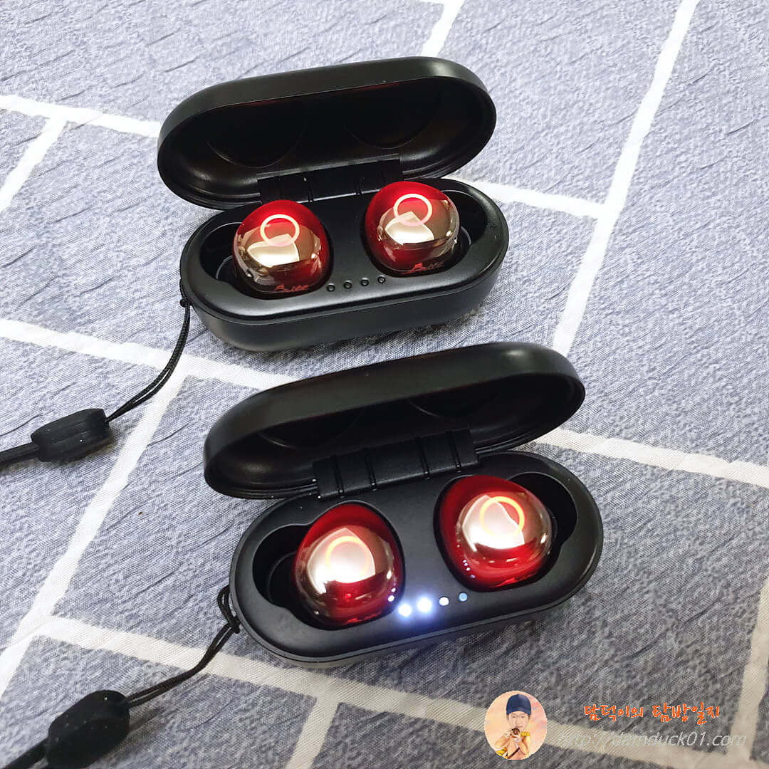 마그네틱 충전 단자에 있는 비닐을 제거하고 케이스에 넣으니 이어 버드에 붉은빛이 들어오면서 충전이 시작됨을 알려줍니다. 반짝반짝 하이그로시 디자인에 저렇게 불이 들어오니까 꽤나 화려해 보입니다.