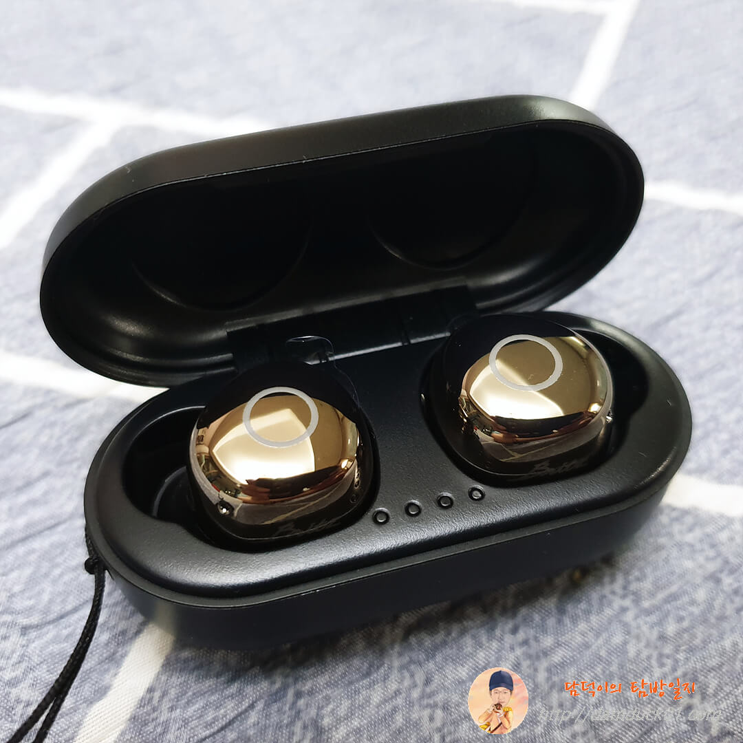 충전 케이스를 열면 반짝반짝하는 하이그로시 재질의 이어 버드가 모습을 드러냅니다. 케이스 가운데에는 충전 케이스의 배터리 상태를 확인할 수 있는 4개의 LED가 보이는데 개인적으로는 이 배터리 잔량 표시는 뚜껑을 열지 않아도 확인할 수 있는 외부에 위치하는 게 좋다는 생각을 가지고 있는데 브리츠의 경우는 아직 많은 모델들이 전부 뚜껑 안쪽에 위치하고 있어요.