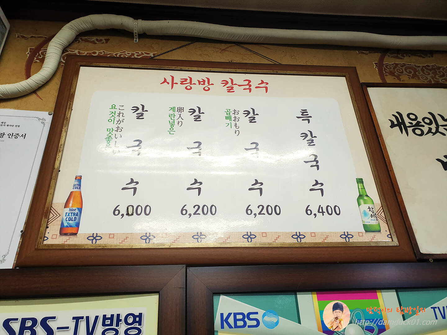 하지만 진정 칼국수를 맛있게 먹는다는 건 배추김치에 국수를 말아서 먹는다는 것. 그것이 진정 맛을 즐기는 사람의 비법이랍니다. 사랑방 칼국수는 밖에 간판도 그렇고 안에 벽에도 온통 방송에 나왔던 것들로 도배가 되어 있더라고요. 수요 미식회, 생활의 달인, 생생 정보통 등 이런 방송 탄 맛집들을 찾아다니는 편은 아니고 100% 신뢰하지는 않아요. 맛이라는 건 어디까지나 주관적이라는 생각을 강하게 가지고 있거든요.