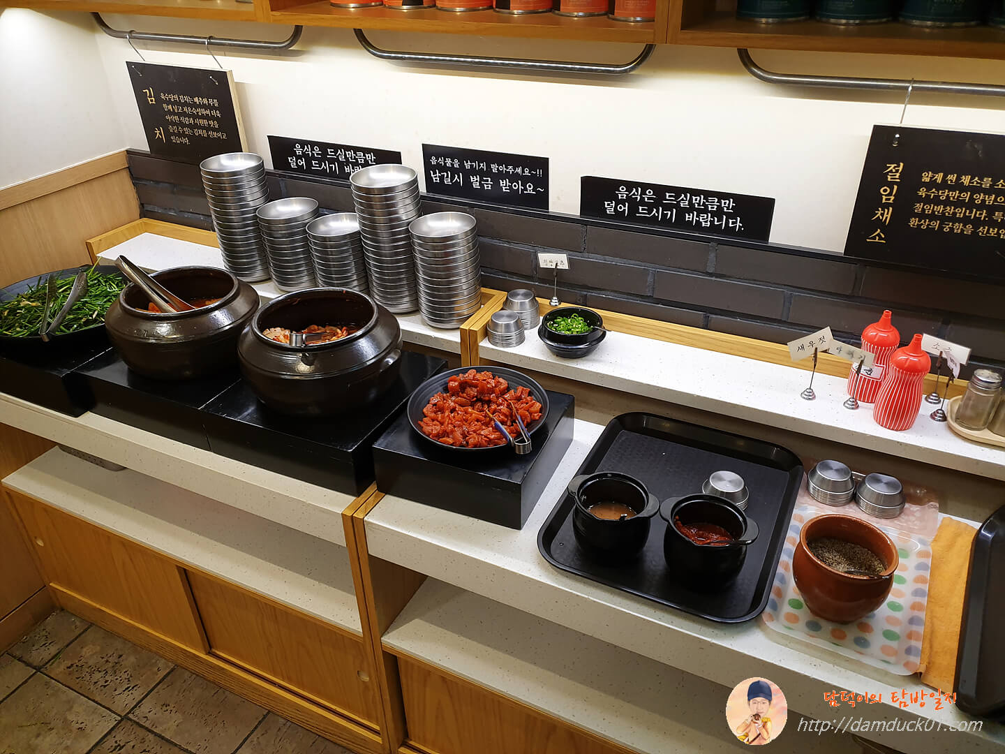 육수당의 반찬은 전부 셀프, 심지어 새우젓과 들깨까지 전부 다 모조리 셀프예요. 이 정도의 셀프 반찬 바는 처음 보는 거 같아요.