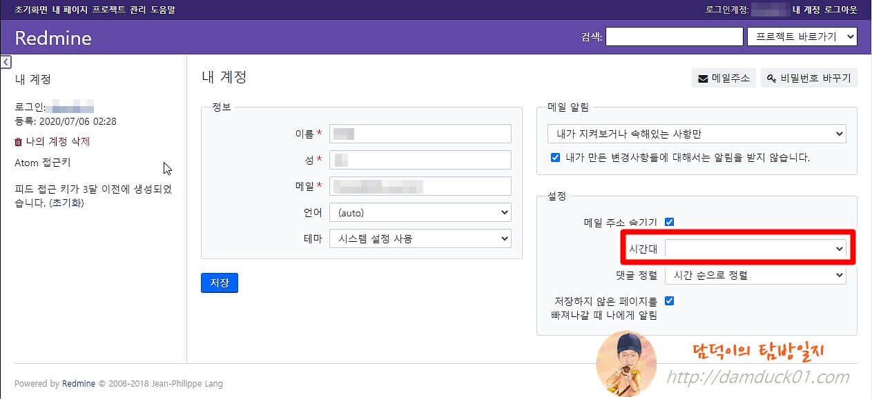 바로 레드마인에서 내 계정 페이지로 이동을 하면 사용 중인 테마에 따라 보이는 게 약간 다르긴 하겠지만 항목은 비슷할 텐데요. 내 계정 페이지에 있는 항목 중 시간대라는 항목을 볼 수 있을 거예요. 이 시간대에서 [(GMT + 09:00) Seoul]을 선택하시고 저장하시면 모든 데이터의 시간대를 한국 시간대로 확인할 수 있게 된답니다.