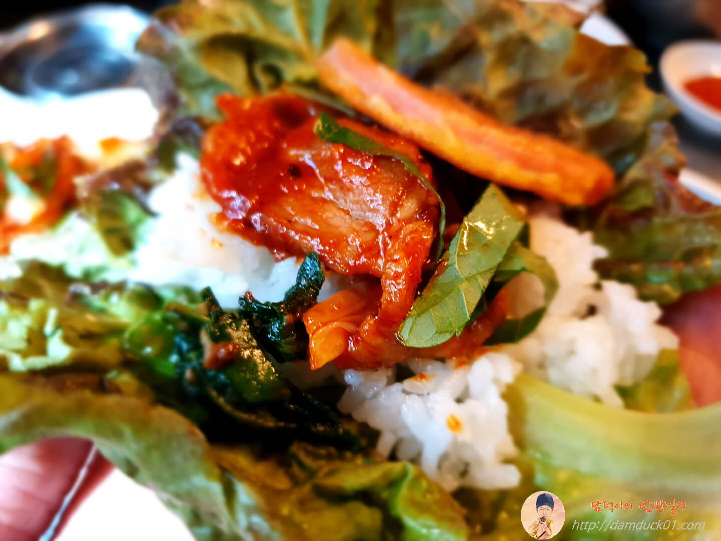 이렇게 몇 번 반복하면 식사는 끝이 납니다. 이렇게 쌈 싸 먹으면 밥을 금방 먹게 되는 거 같아요. 몇 번 먹으면 밥이 없다니까요. ㅋ