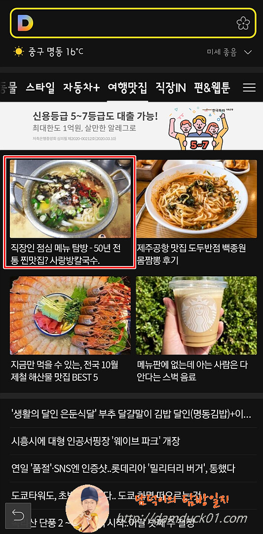게다가 다음 메인 등록이 3일이나 유지가 됐어요. 10월 6일부터 8일까지 다음 모바일의 여행맛집채널 등록이 유지돼서 10월의 시작을 너무 기분 좋게 했네요. 실은 최근 4개월간 점점 통계 기록이 나빠져서 매달 하던 결산 포스팅도 안 하고 있었거든요. 그런데 이번 등록 한 번으로 자신감 회복했습니다. 참! 다음 메인 등록된 글 이야기를 안 했네요. 이번에 등록된 포스트는 역시나 직장인 점심 메뉴 탐방 글인데요.