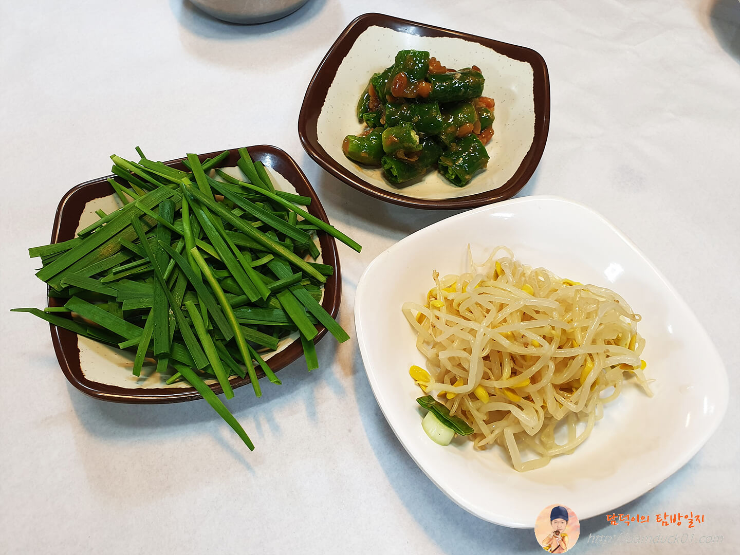 주문 후 기본 반찬으로는 이렇게 세 가지를 가져다줍니다. 고추무침, 생부추, 콩나물.
