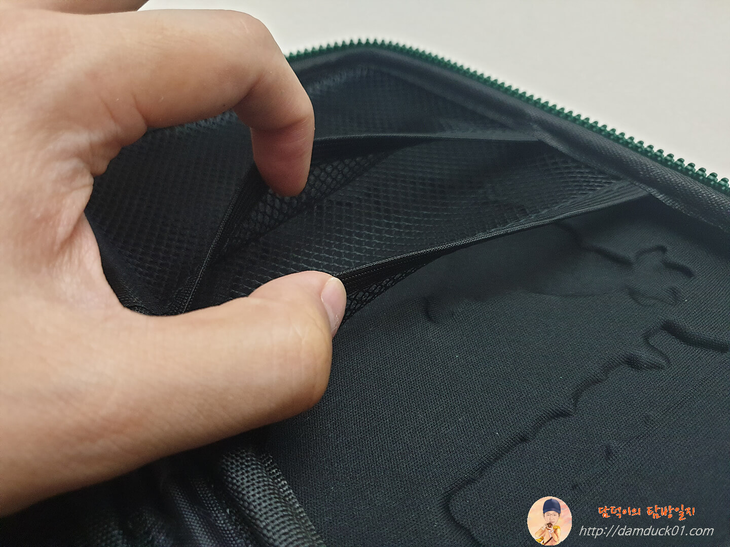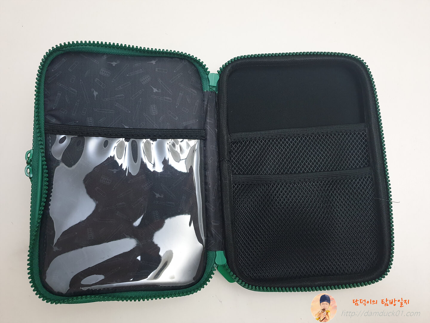 메인과는 다르게 고무밴드는 없이 좌측에는 PVC 포켓으로 투명한 수납공간이 있고 우측에는 2단 구성의 메시 포켓이 있어요.