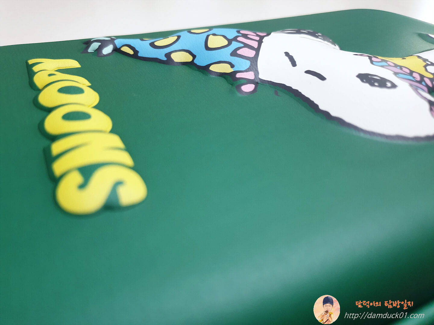 전면에 SNOOPY 영문과 스누피와 우드스톡의 포옹은 양각 처리가 되어 있어요.