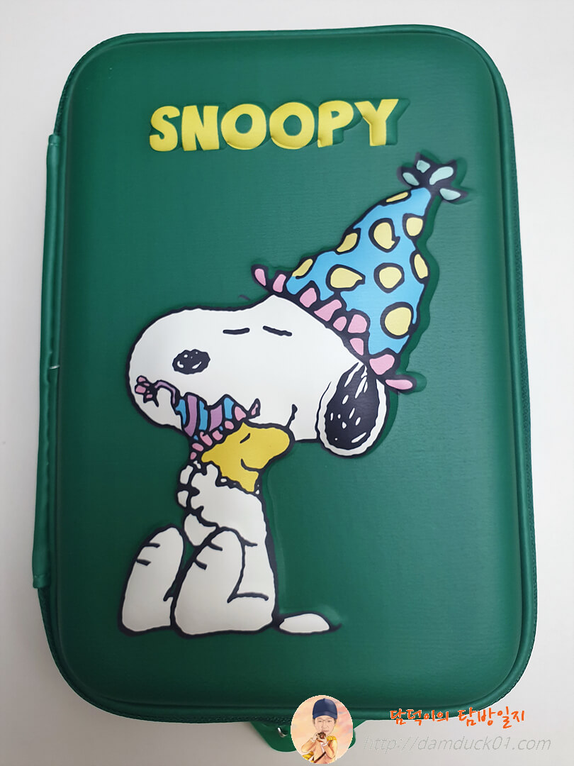 큰 크기 다양한 수납공간 귀여운 스누피 디자인 전체적으로 마음에 드는데 지퍼와 뒷면 접합부 마감 때문에 좋은 이미지까지 까먹은 알라딘 굿즈 2단 하드탑 펜 케이스네요.