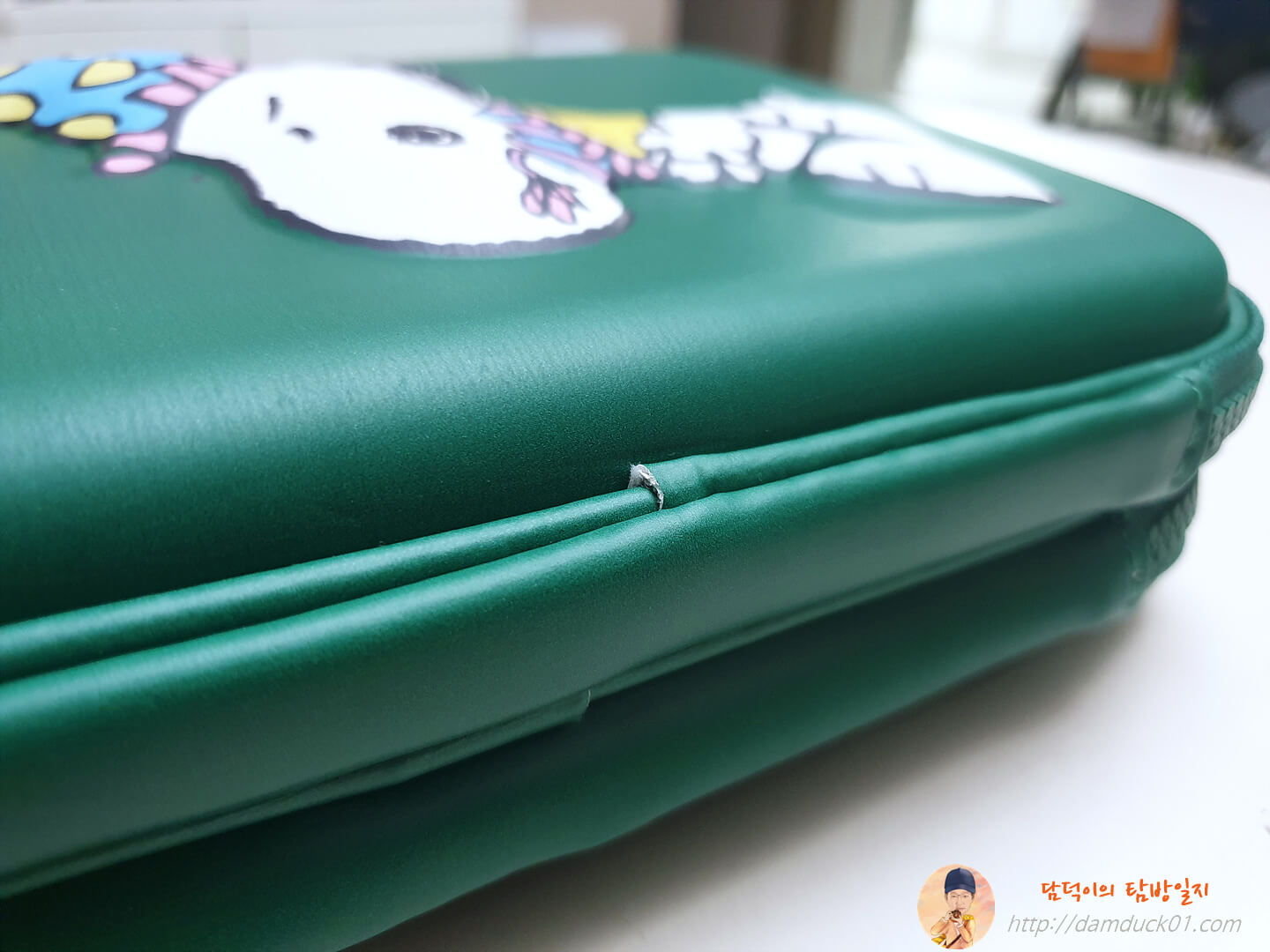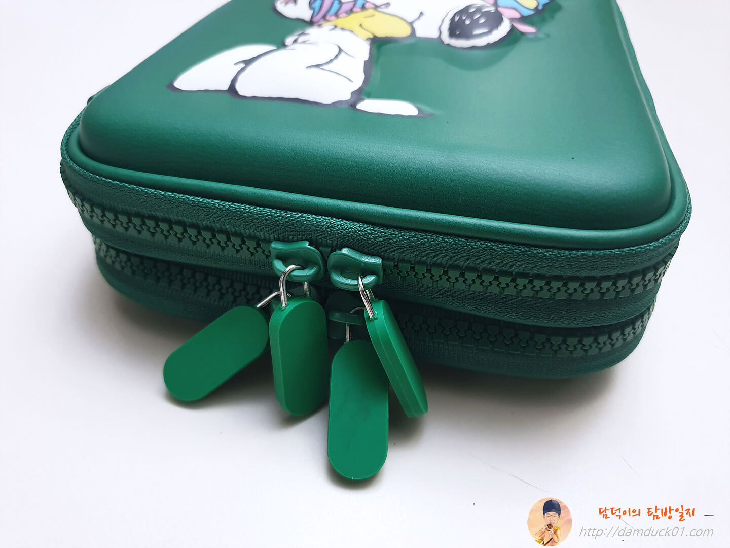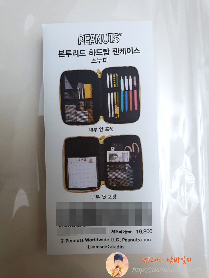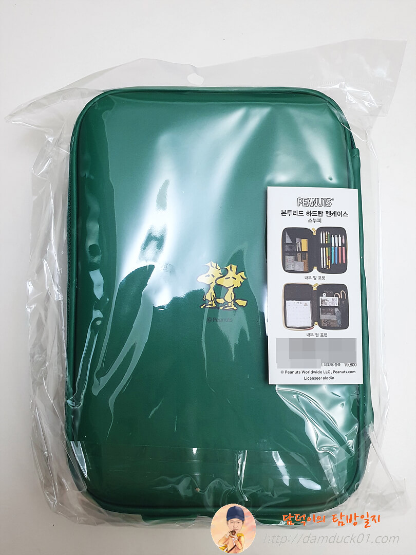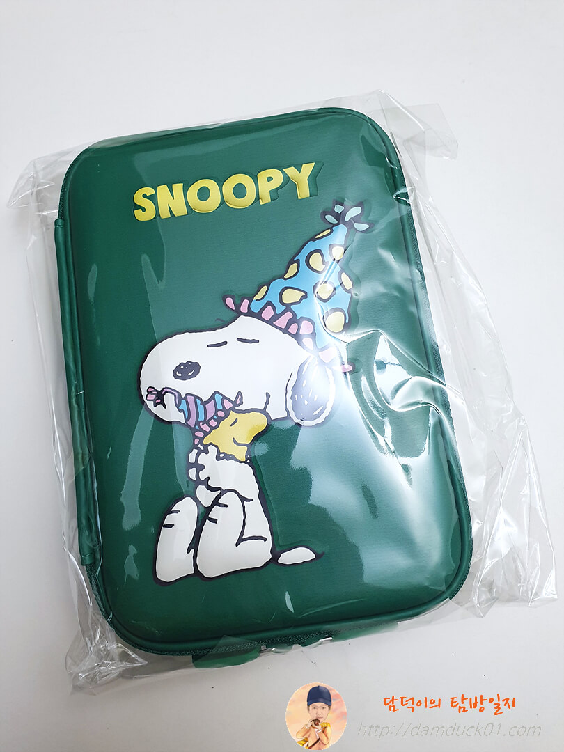 큰 크기 다양한 수납공간 귀여운 스누피 디자인 전체적으로 마음에 드는데 지퍼와 뒷면 접합부 마감 때문에 좋은 이미지까지 까먹은 알라딘 굿즈 2단 하드탑 펜 케이스네요.