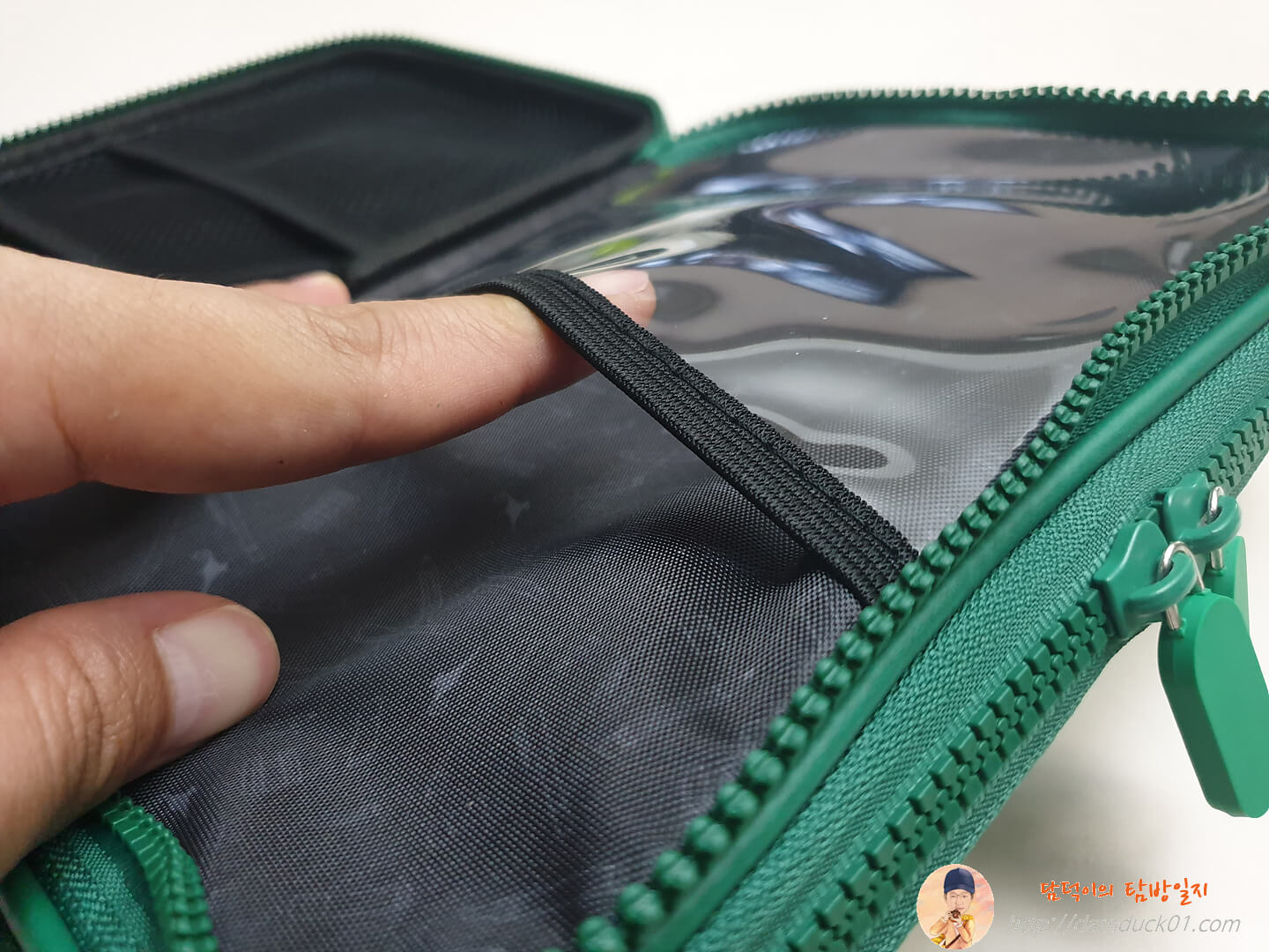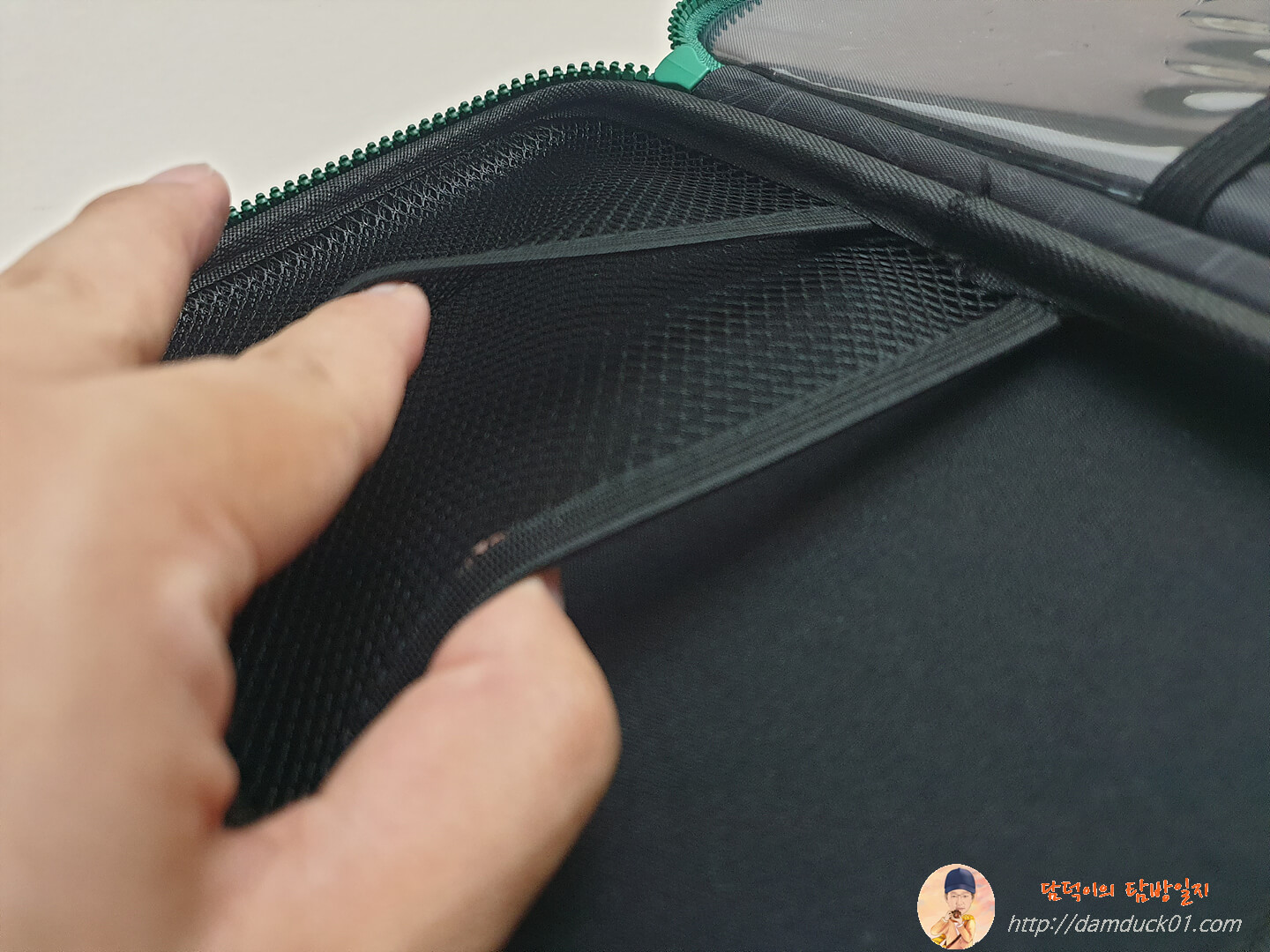 메인과는 다르게 고무밴드는 없이 좌측에는 PVC 포켓으로 투명한 수납공간이 있고 우측에는 2단 구성의 메시 포켓이 있어요.