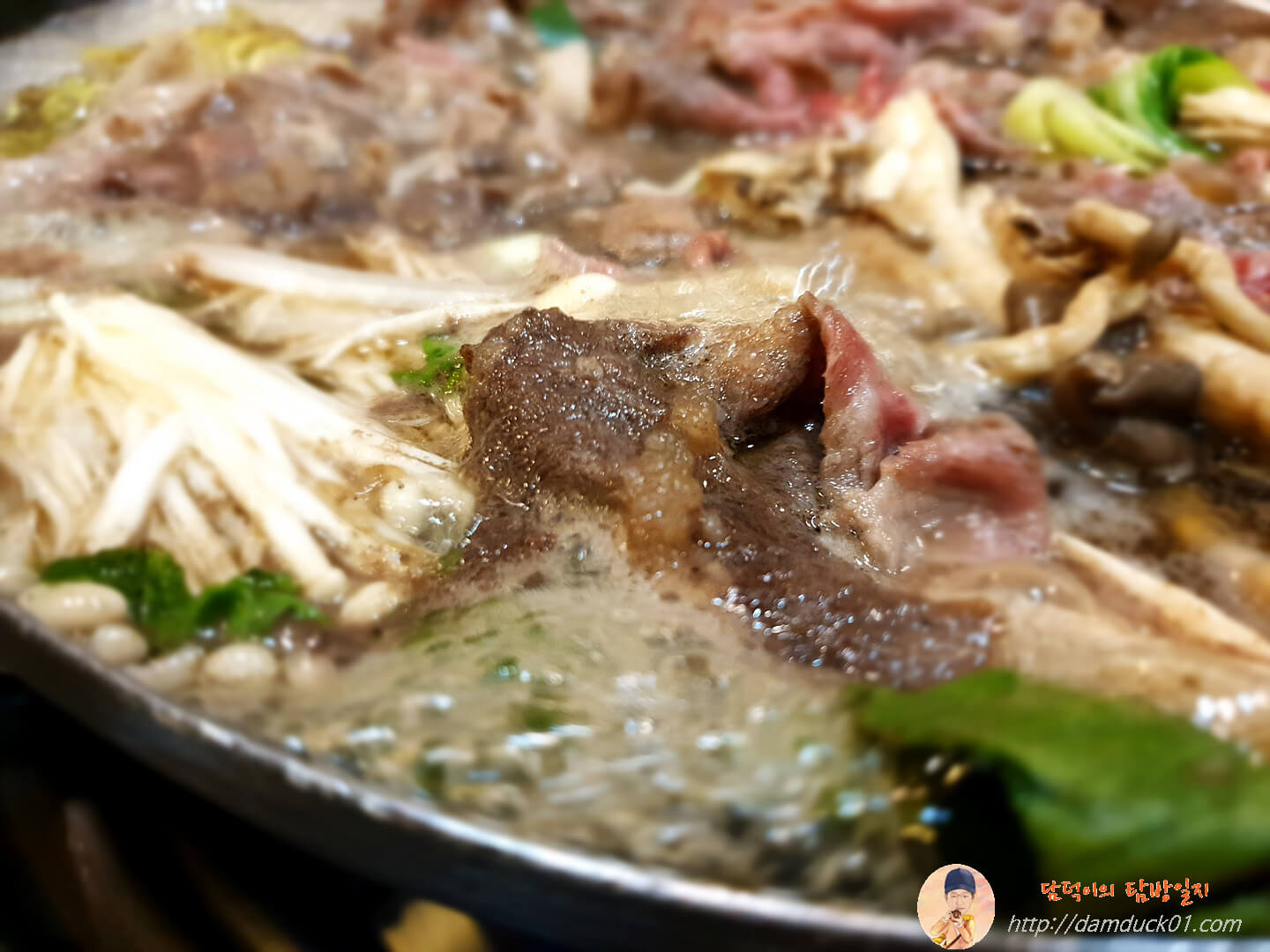 점점 세게 끓기 시작해서 바글바글 단계까지 왔네요. 이제 슬슬 먹을 준비를 해야죠. 위에서 이야기했듯 고기나 버섯 양이 부족하지는 않아서 좋았어요. 그런데 제대로 먹으려면 한참을 끓여줘야 했습니다. 먹는 동안 저나 탐방원은 조금 싱겁다는 의견이었거든요. 그런데 거의 다 먹을 때쯤 제대로 졸아서 간이 맞더라고요.