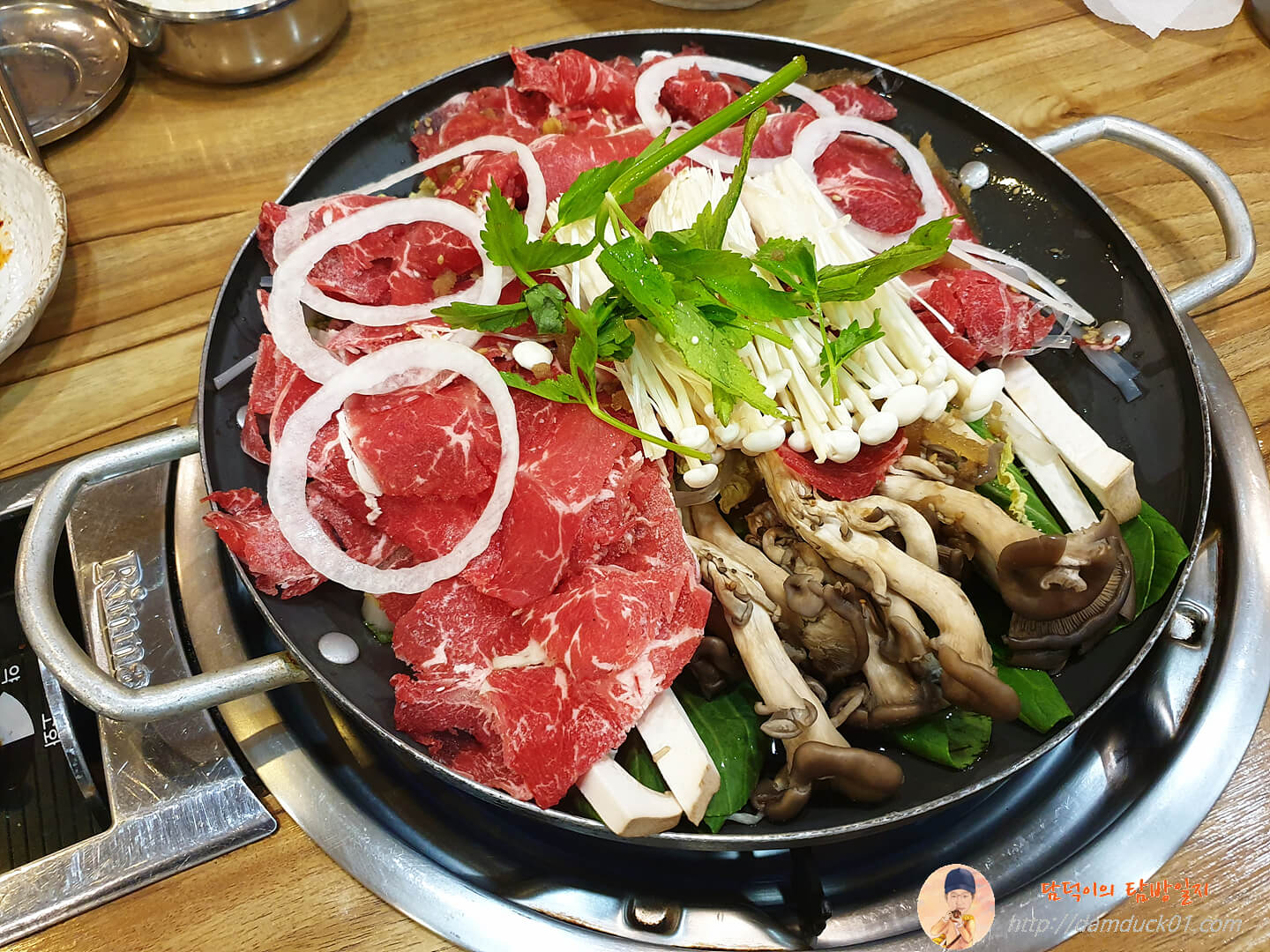 주문한 불고기 전골 (8,000원)이 나왔습니다. 버섯도 꽤 푸짐해 보이고 고기도 적어 보이지는 않네요.