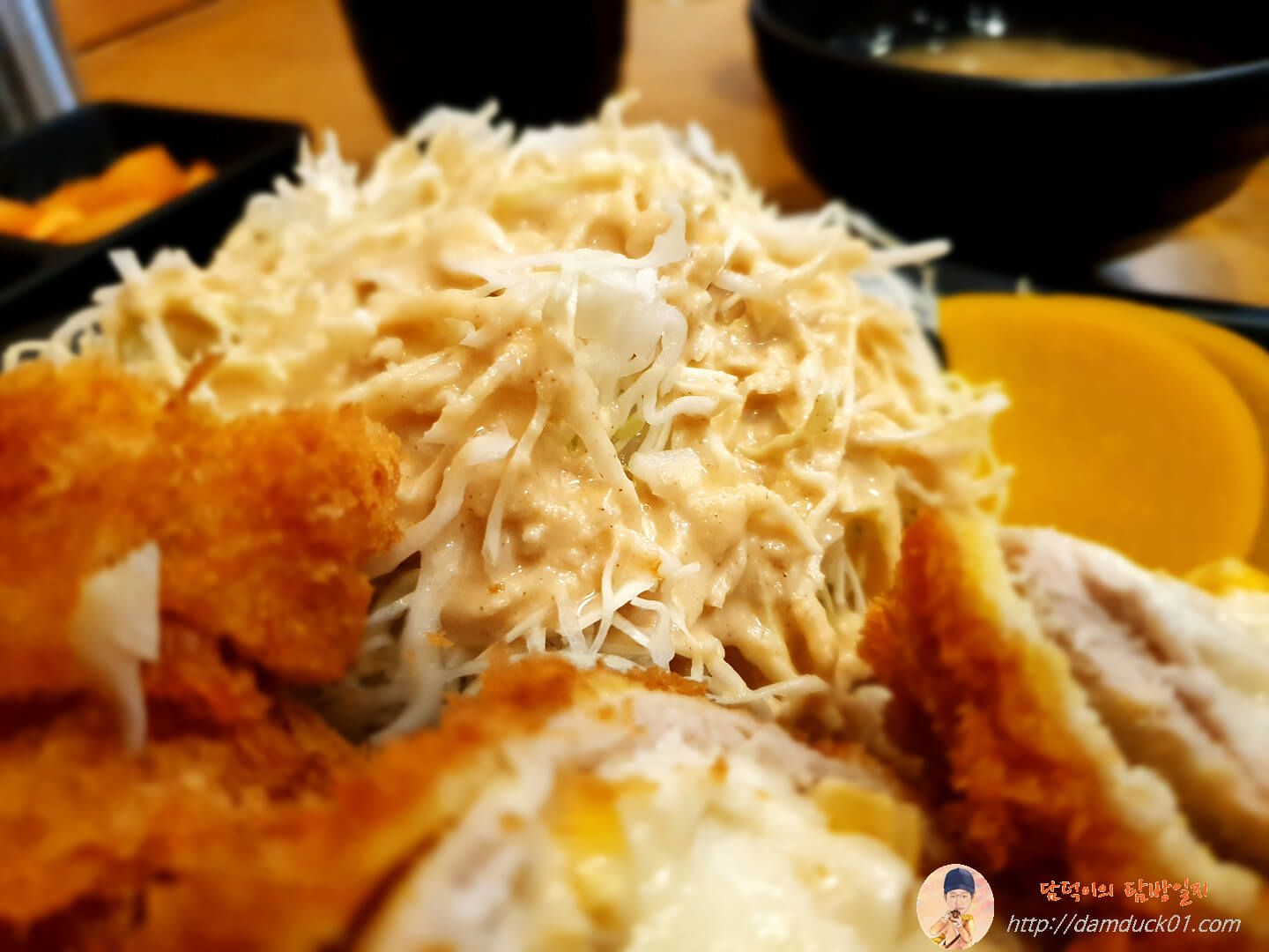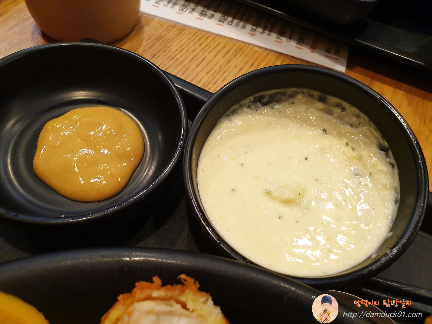 지난번에는 그냥 돈가스 소스만 먹었었는데 이날은 사장님이 겨자 소스랑 섞어 먹으면 더 맛있다고 알려주셔서 겨자 소스와 돈가스 소스를 섞어줬어요.