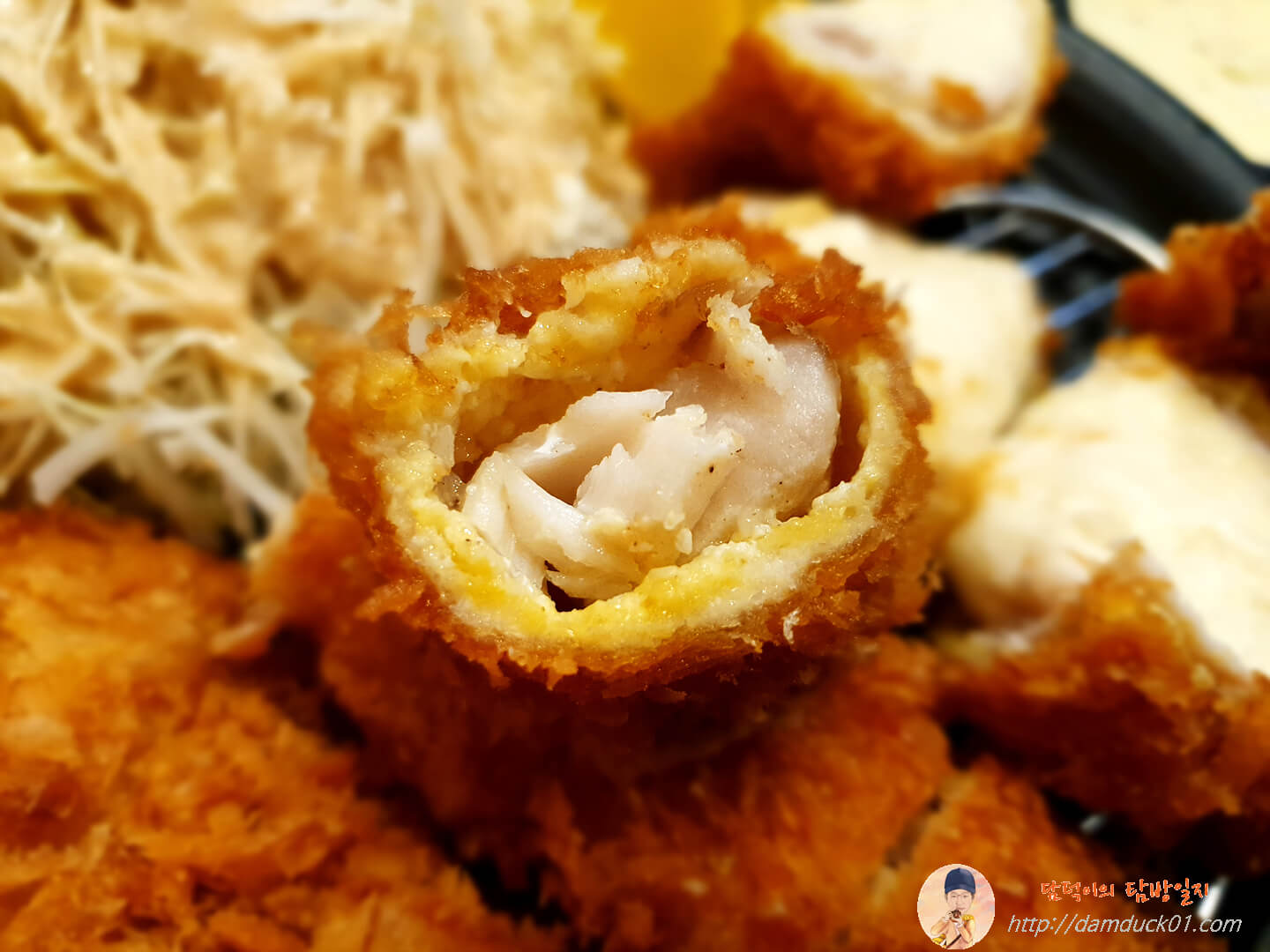 그 옆에는 비주얼 깡패인 치즈 돈가스 네 조각이 있는데 치즈가 가득. 그리고 치즈 안에 캔 옥수수가 박혀있네요.