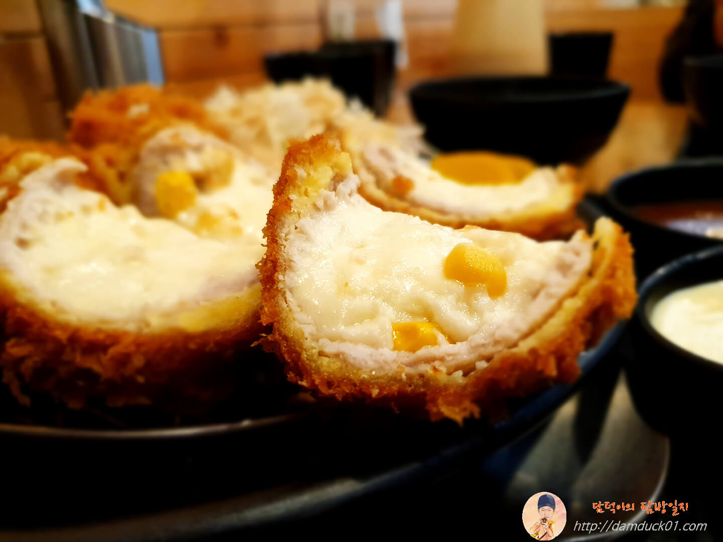 그 옆에는 비주얼 깡패인 치즈 돈가스 네 조각이 있는데 치즈가 가득. 그리고 치즈 안에 캔 옥수수가 박혀있네요.