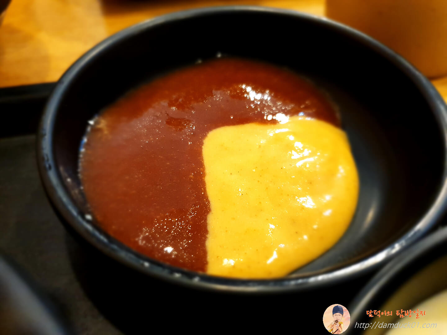지난번에는 그냥 돈가스 소스만 먹었었는데 이날은 사장님이 겨자 소스랑 섞어 먹으면 더 맛있다고 알려주셔서 겨자 소스와 돈가스 소스를 섞어줬어요.