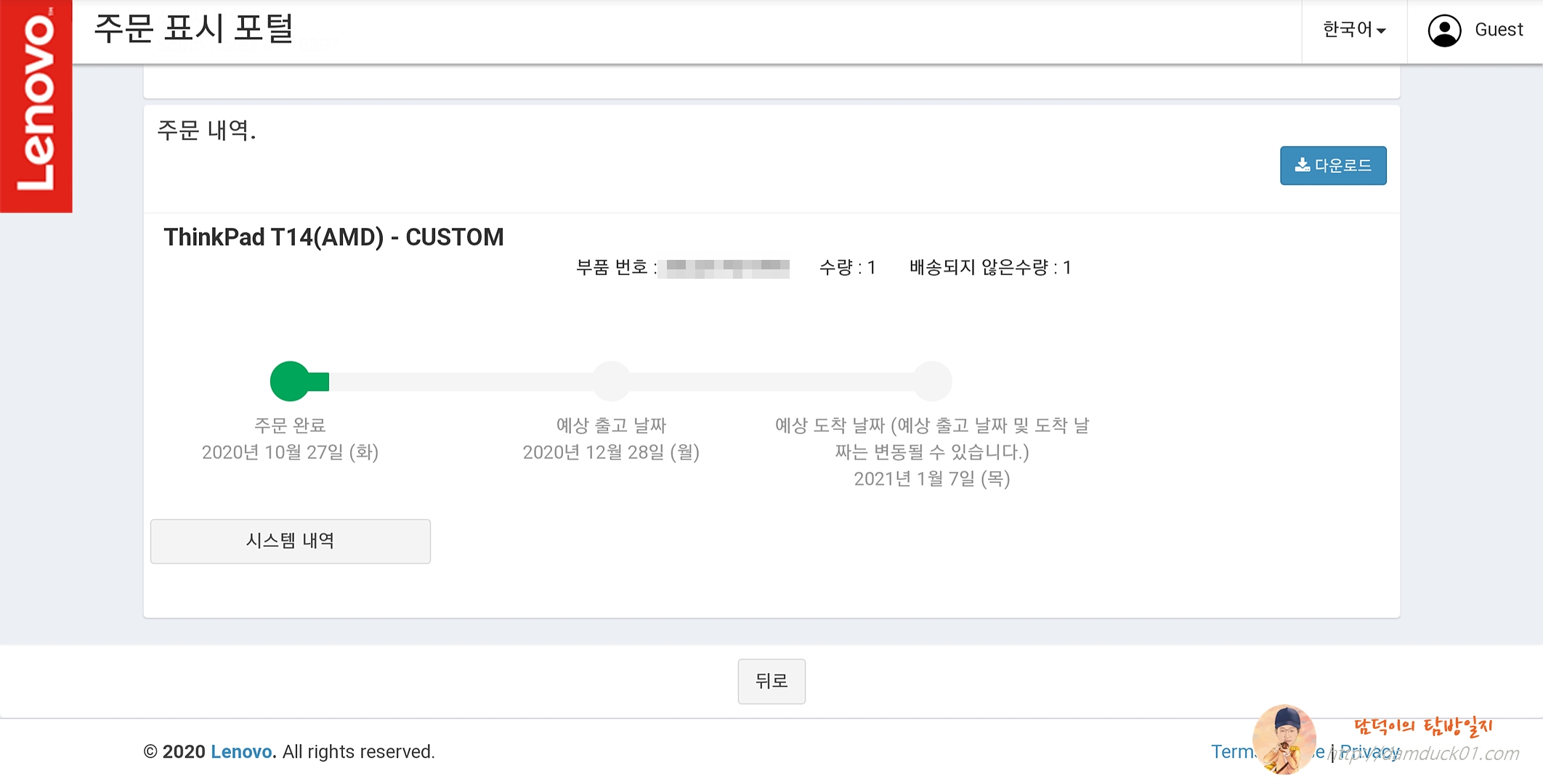 한 3달 정도, 씽크패드의 여러 모델을 가지고 계속 고민하다가 T14로 결정했지만 라이젠 7 옵션의 커스텀이 계속 미뤄지면서 결국 라이젠 7은 아예 홈페이지에서 사라지고 라이젠 4세대 발표까지 이뤄진 상황입니다. 계속 이렇게 기다리다가는 결국 못 살 거 같고 그냥 현실에 맞춰보자는 생각으로 커스텀하고 프로모션 중이라 메모리 업그레이드 무료에 할인 쿠폰 적용해서 10월 27일 결제를 완료했습니다. 배송 시작일은 영업일 기준 16~20일 정도 걸린다고 적혀 있었는데 그냥 질렀죠. 그리고 어제 예상 출고 날짜가 업데이트가 됐는데 헉!