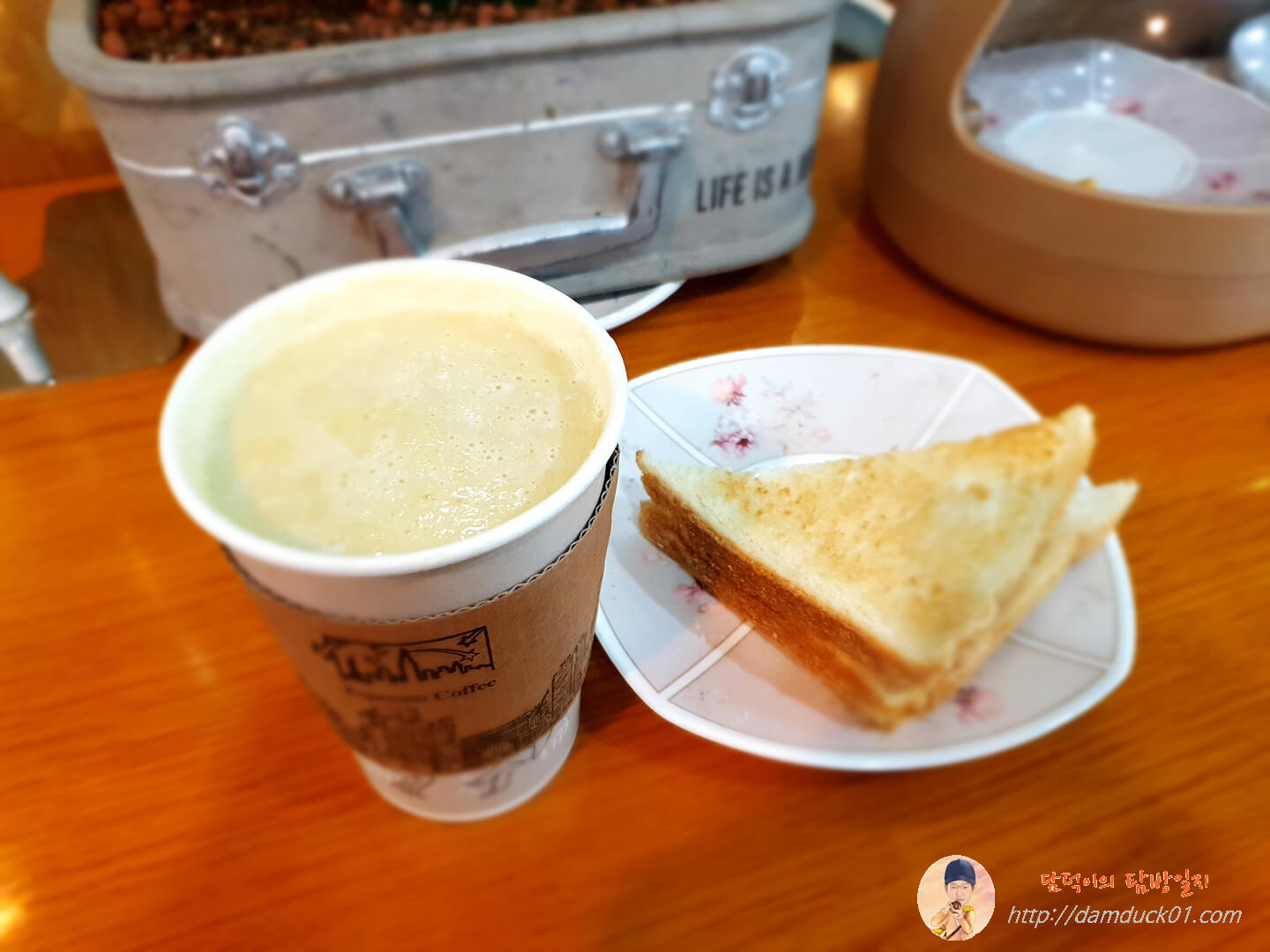 바로 고구마 라테와 토스트입니다. 아무래도 커피 보다야 고구마 라테가 요깃거리로서는 더 괜찮을 거 같아서 주문했고 토스트는 무료랍니다.