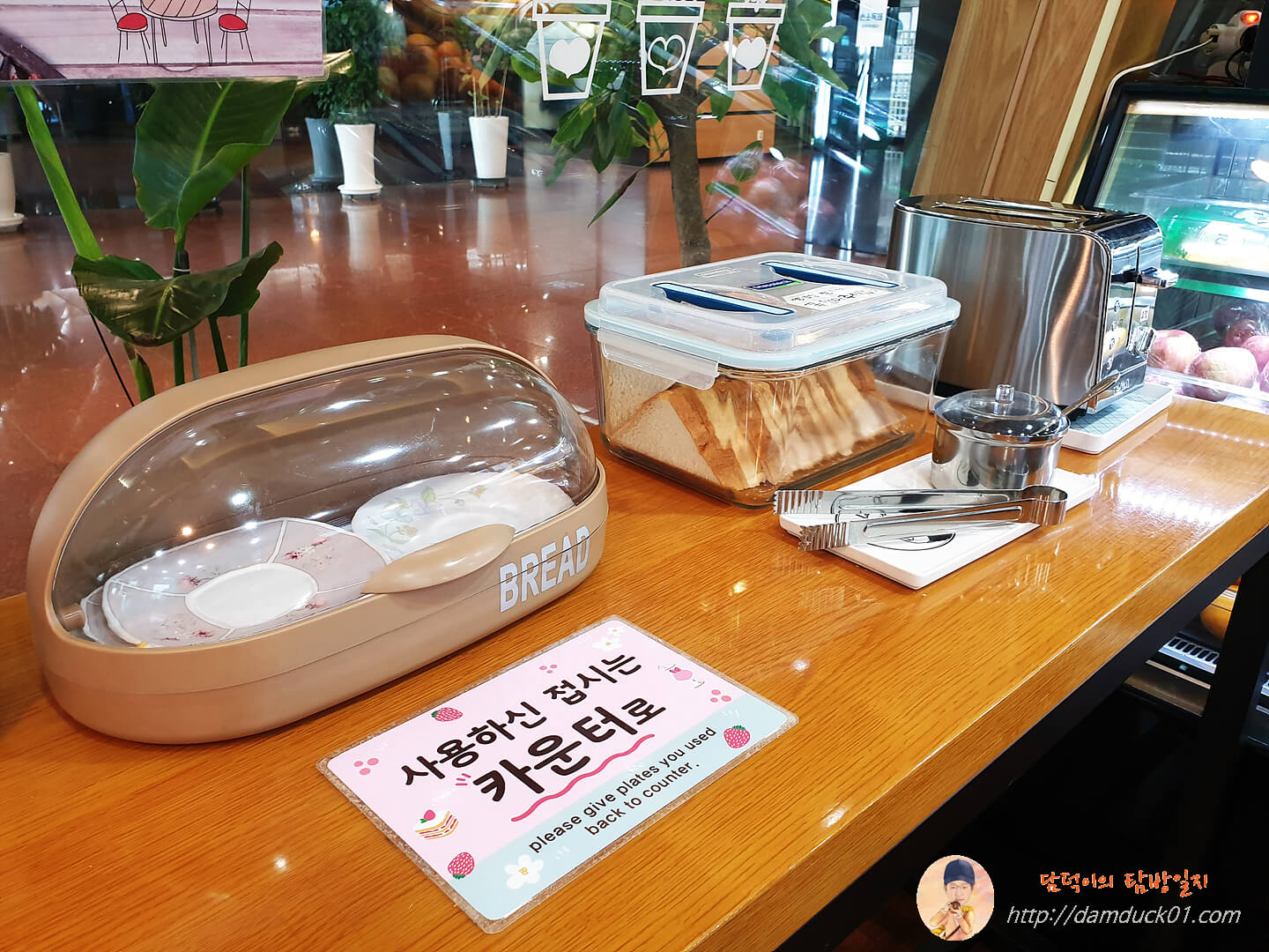 비틀주스에는 바 형태의 테이블에 이렇게 토스트를 만들어 먹을 수 있도록 준비되어 있는데 이 토스트가 무료예요. 토스트 가져다 먹을 접시까지 깔끔하게 준비되어 있어요.