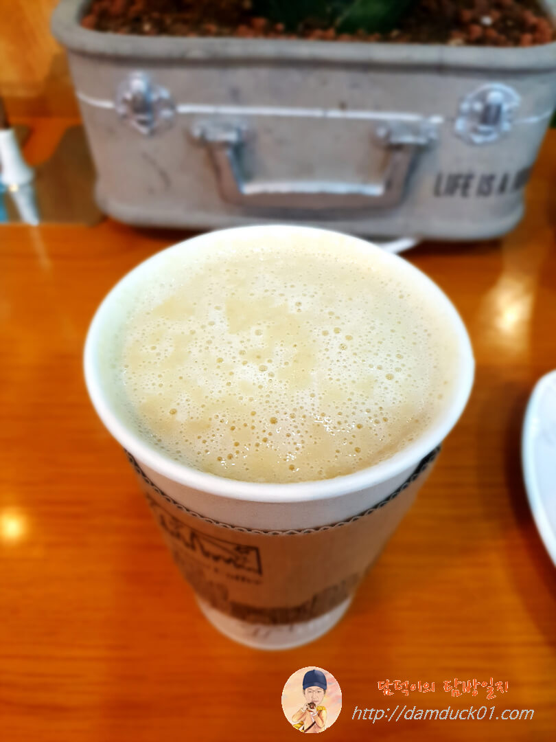 토스트를 다 먹고 나니 제가 주문한 고구마 라테가 나왔네요. 평소에는 거의 안 먹는 메뉴인데 아무래도 식사 대용으로 마실 음료를 찾다 보니 고구마 라테를 주문했네요. 고구마와 우유로 만드는 음료니까 나름 포만감이 있을 거 같아서요. 이렇게 나온 고구마 라테랑 토스트를 하나 더 만들어서 점심 해결, 가성비 폭발한 점심 한 끼였습니다.