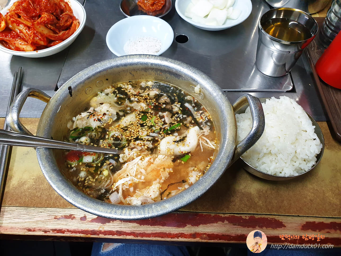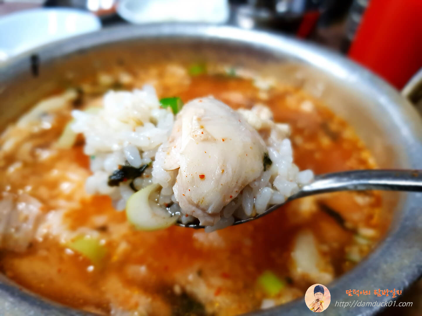 제대로 칼칼한 맛의 닭곰탕을 즐길 수 있습니다. 밥 위에 닭고기 얹어서도 먹고 김치를 이렇게 얹어서 먹기도 했는데 어느 순간부터 땀이 나더라고요.